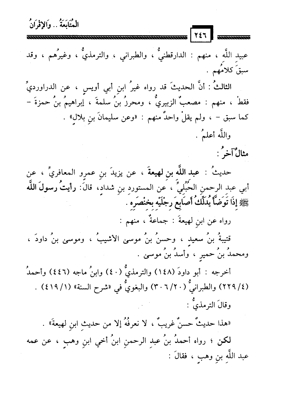 حديث: عبد الله بن لهيعة، عن يزيد بن عمرو المعافري، عن أبي عبد الرحمن الحُبُلِي، عن المستورد بن شداد، قال: رأيت رسول الله - صلى الله عليه وسلم - إذا توضأ يدلك أصابع رجليه بخنصره.