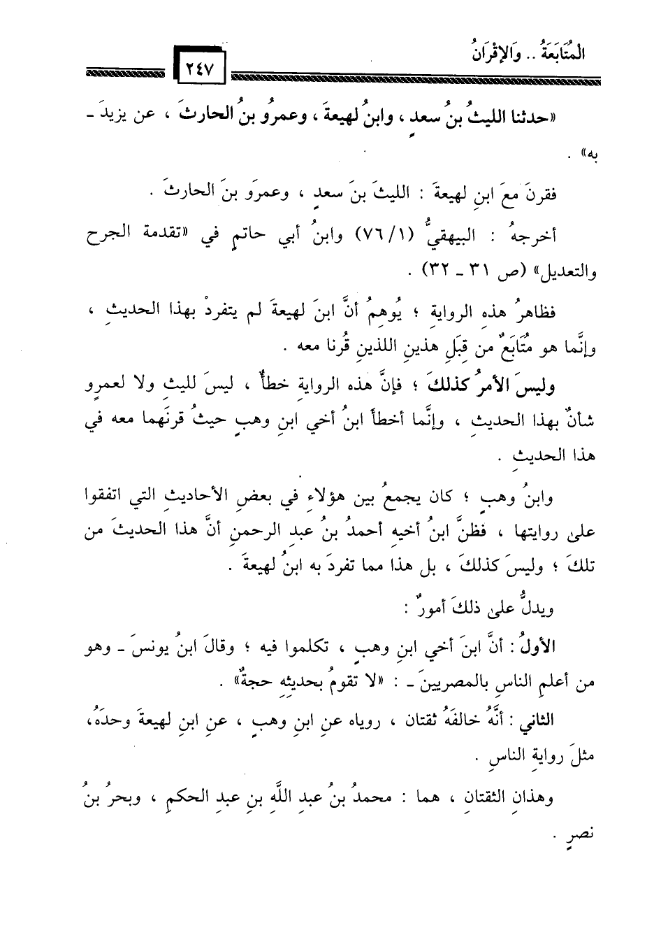 وليس الأمر كذلك؛ فإن هذه الرواية خطأ، ليس لليث ولا لعمرو شأن بهذا الحديث، وإنما أخطأ ابن أخي ابن وهب حيث قرنهما معه في هذا الحديث.