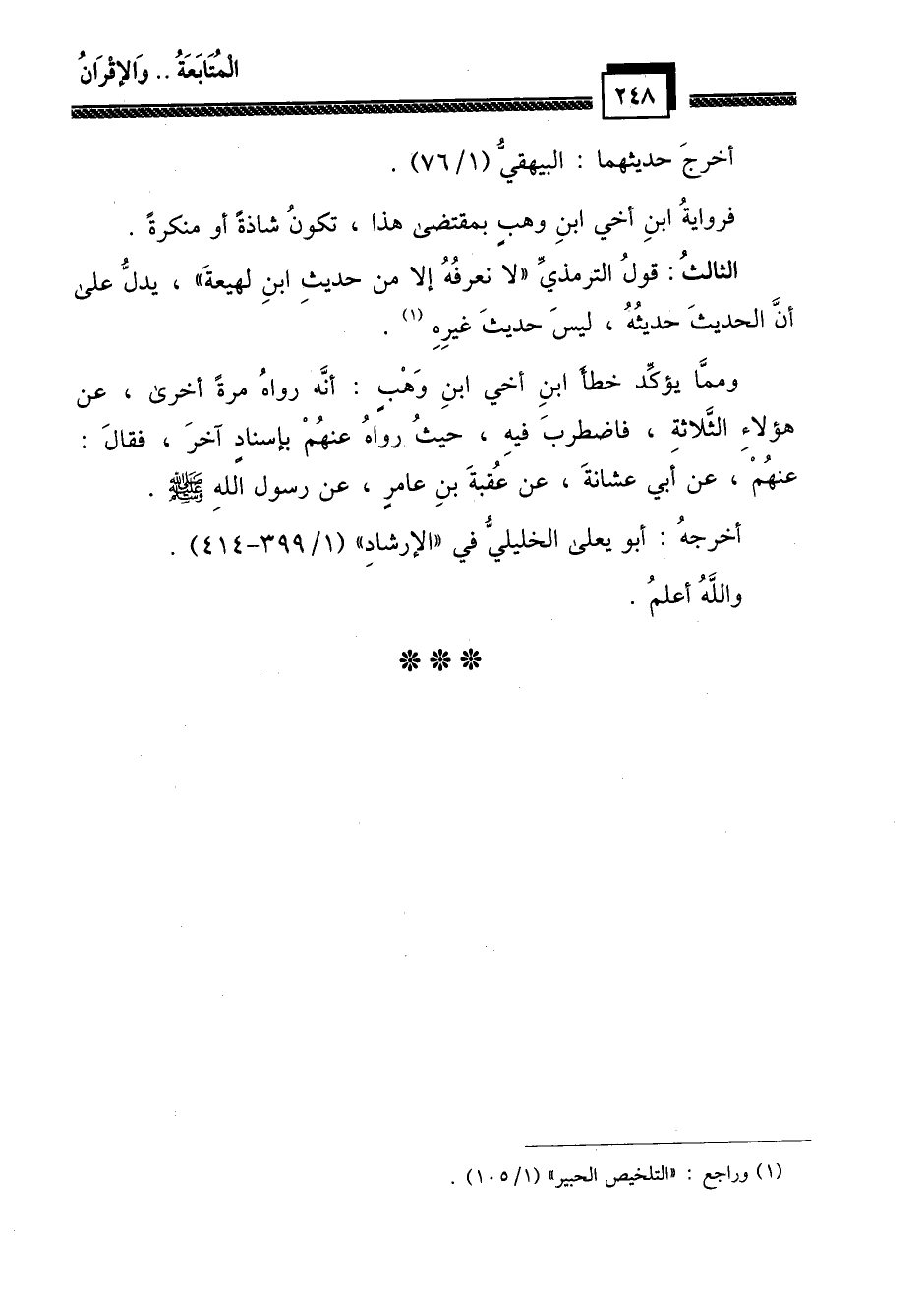ومما يؤكد خطأ ابن أخي ابن وهب: أنه رواه مرة أخرى، عن هؤلاء الثلاثة، فاضطرب فيه، حيث رواه عنهم بإسناد آخر، فقال: عنهم، عن أبي عشانة، عن عقبة بن عامر، عن رسول الله - صلى الله عليه وسلم -.