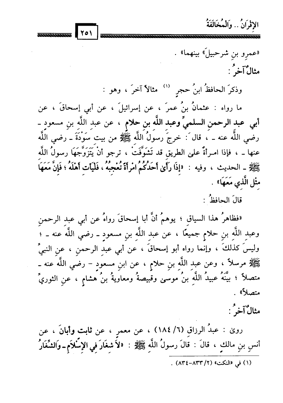 " فظاهر هذا السياق؛ يوهم أن أبا إسحاق رواه عن أبي عبد الرحمن وعبد الله بن حلام جميعاً، عن عبد الله بن مسعود ـ رضي الله عنه ـ؛ وليس كذلك، وإنما رواه أبو إسحاق، عن أبي عبد الرحمن، عن النبي - صلى الله عليه وسلم - مرسلاً، وعن عبد الله بن حلام، عن ابن مسعود ـ رضي الله عنه ـ متصلاً؛ بينه عبيد الله بن موسى وقبيصة ومعاوية بن هشام، عن الثوري متصلاً ".