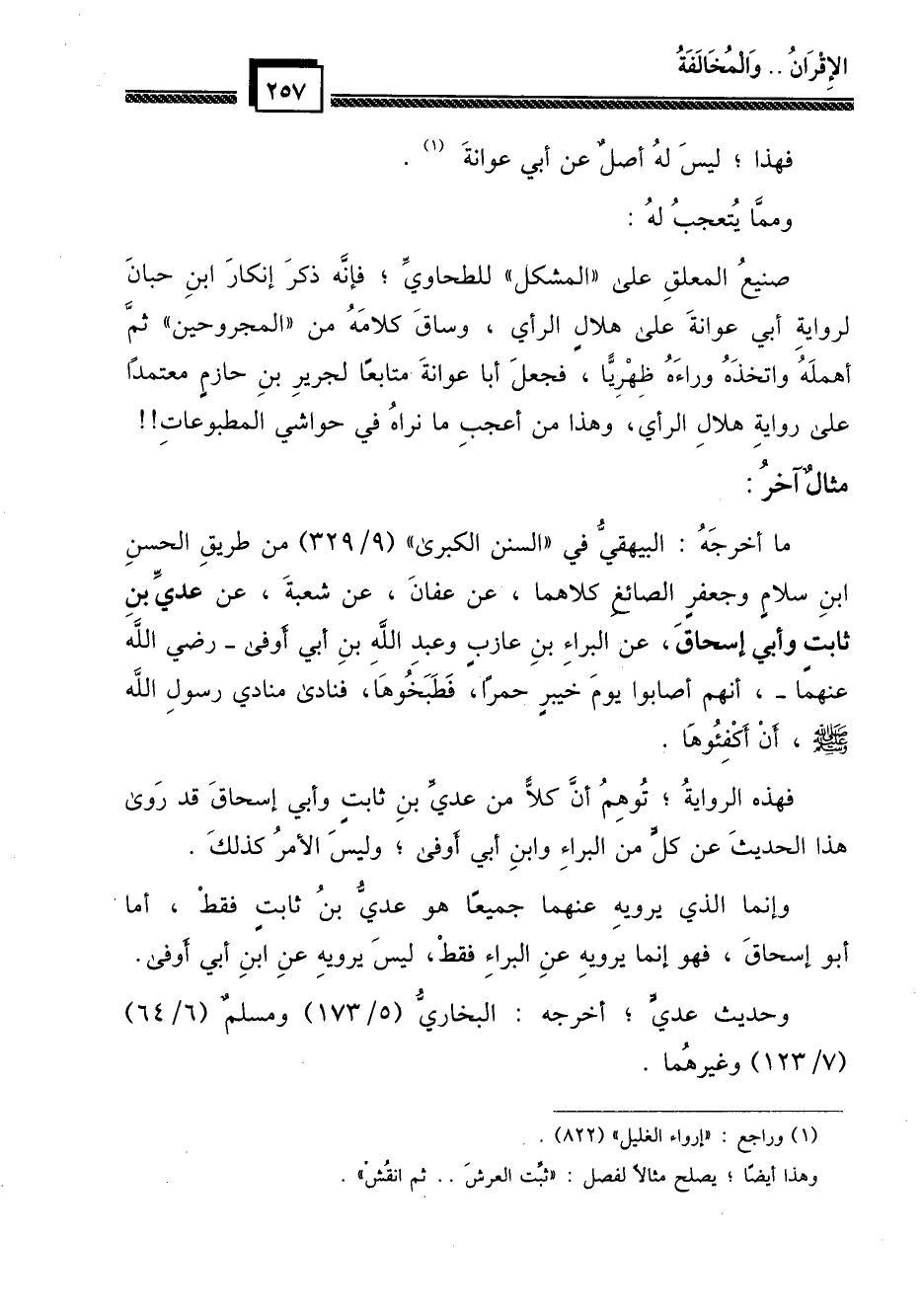 صنيع المعلق على " المشكل " للطحاوي؛ فإنه ذكر إنكار ابن حبان لرواية أبي عوانة على هلال الرأي، وساق كلامه من " المجروحين " ثم أهمله واتخذه وراءه ظهرياً، فجعل أبا عوانة متابعاً لجرير بن حازم معتمداً على رواية هلال الرأي، وهذا من أعجب ما نراه في حواشي المطبوعات!!