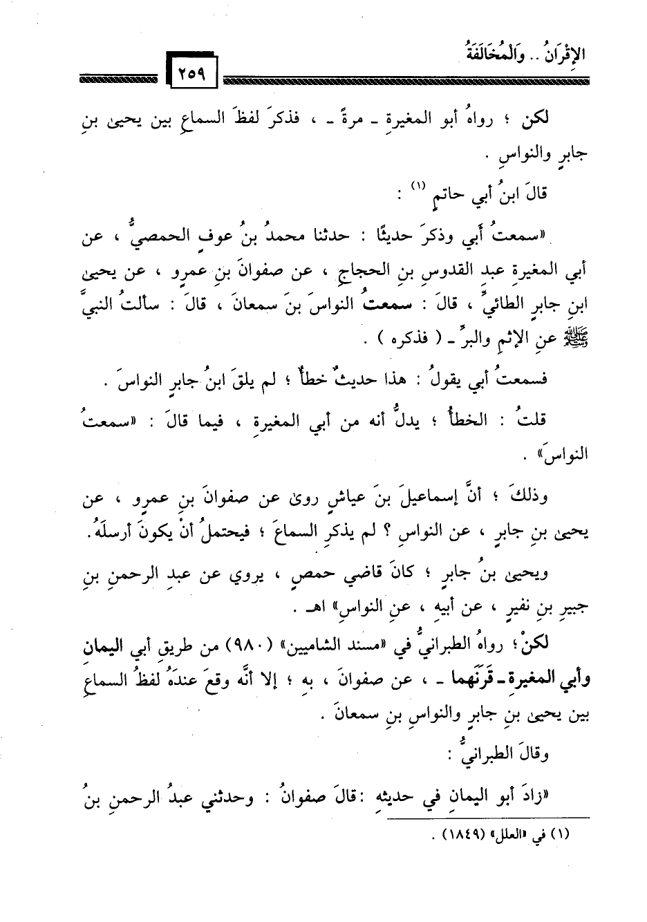لكن؛ رواه الطبراني في " مسند الشاميين " (980) من طريق أبي اليمان وأبي المغيرة ـ قرنهما ـ، عن صفوان، به؛ إلا أنه وقع عنده لفظ السماع بين يحيى بن جابر والنواس بن سمعان.