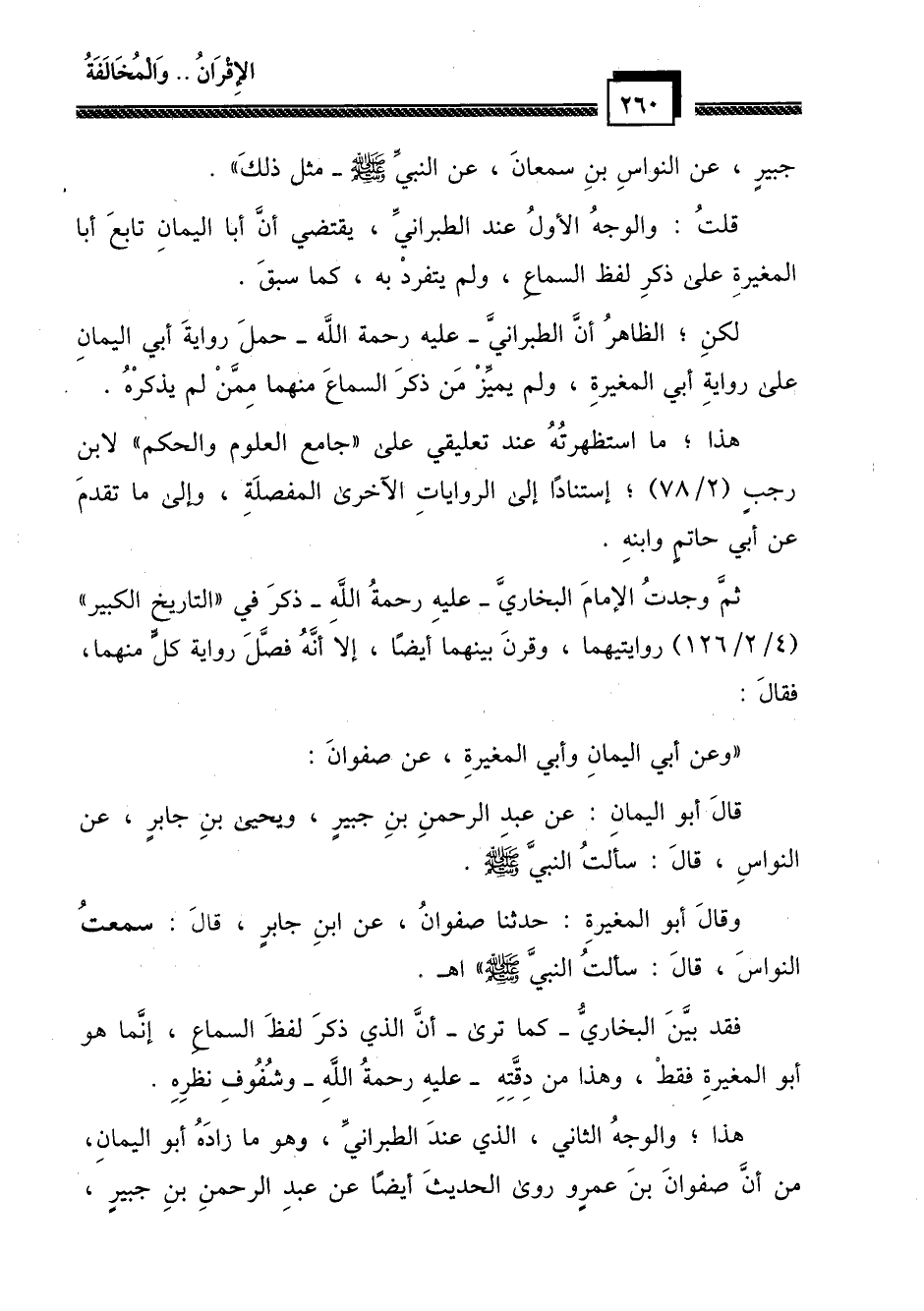 قال أبو اليمان: عن عبد الرحمن بن جبير، ويحيى بن جابر، عن النواس، قال: سألت النبي - صلى الله عليه وسلم -.
