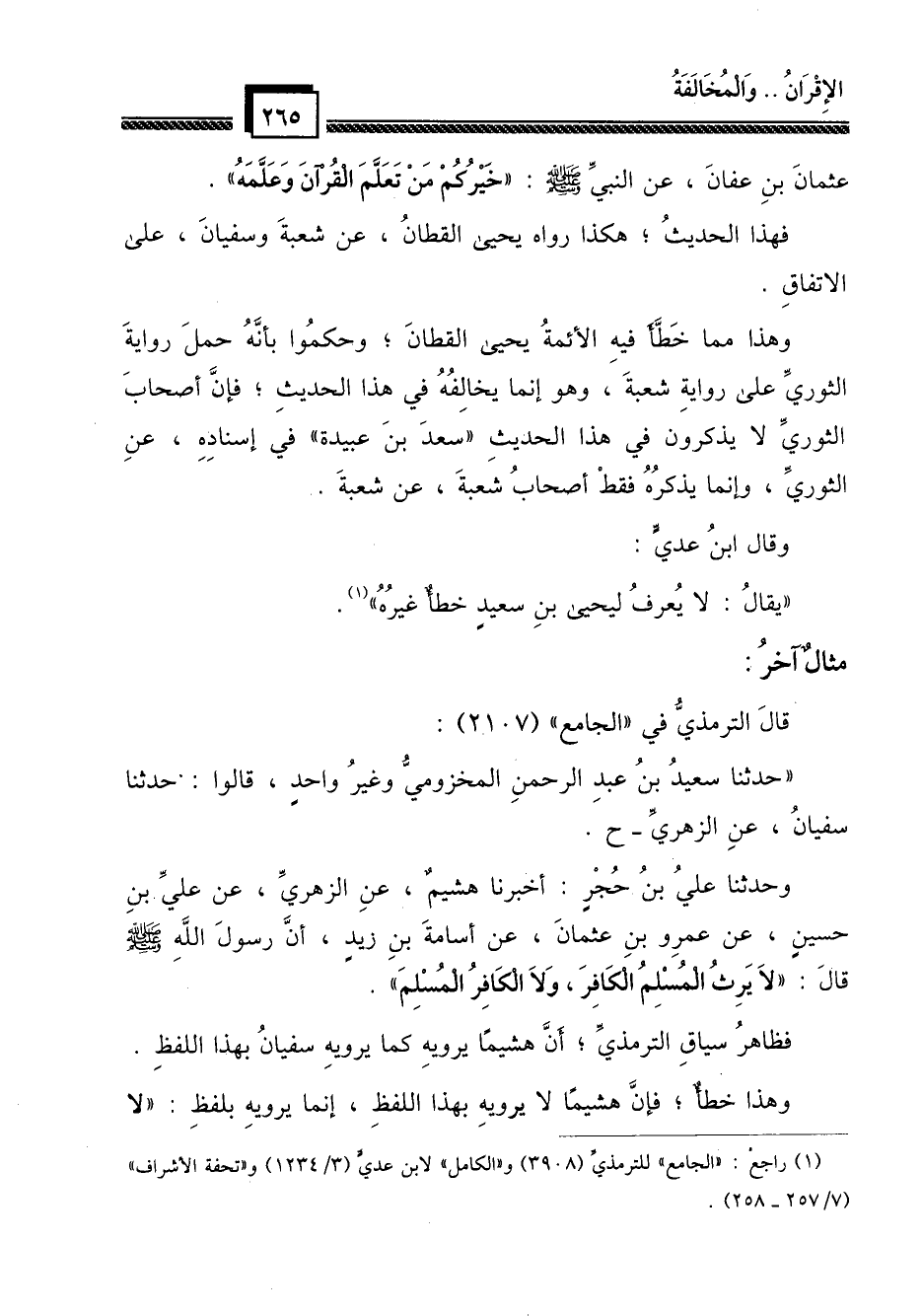 وهذا مما خطَّأ فيه الأئمة يحيى القطان؛ وحكموا بأنه حمل رواية الثوري على رواية شعبة، وهو إنما يخالفه في هذا الحديث؛ فإن أصحاب الثوري لا يذكرون في هذا الحديث "سعد بن عبيدة" في إسناده، عن الثوري، وإنما يذكره فقط أصحاب شعبة، عن شعبة.