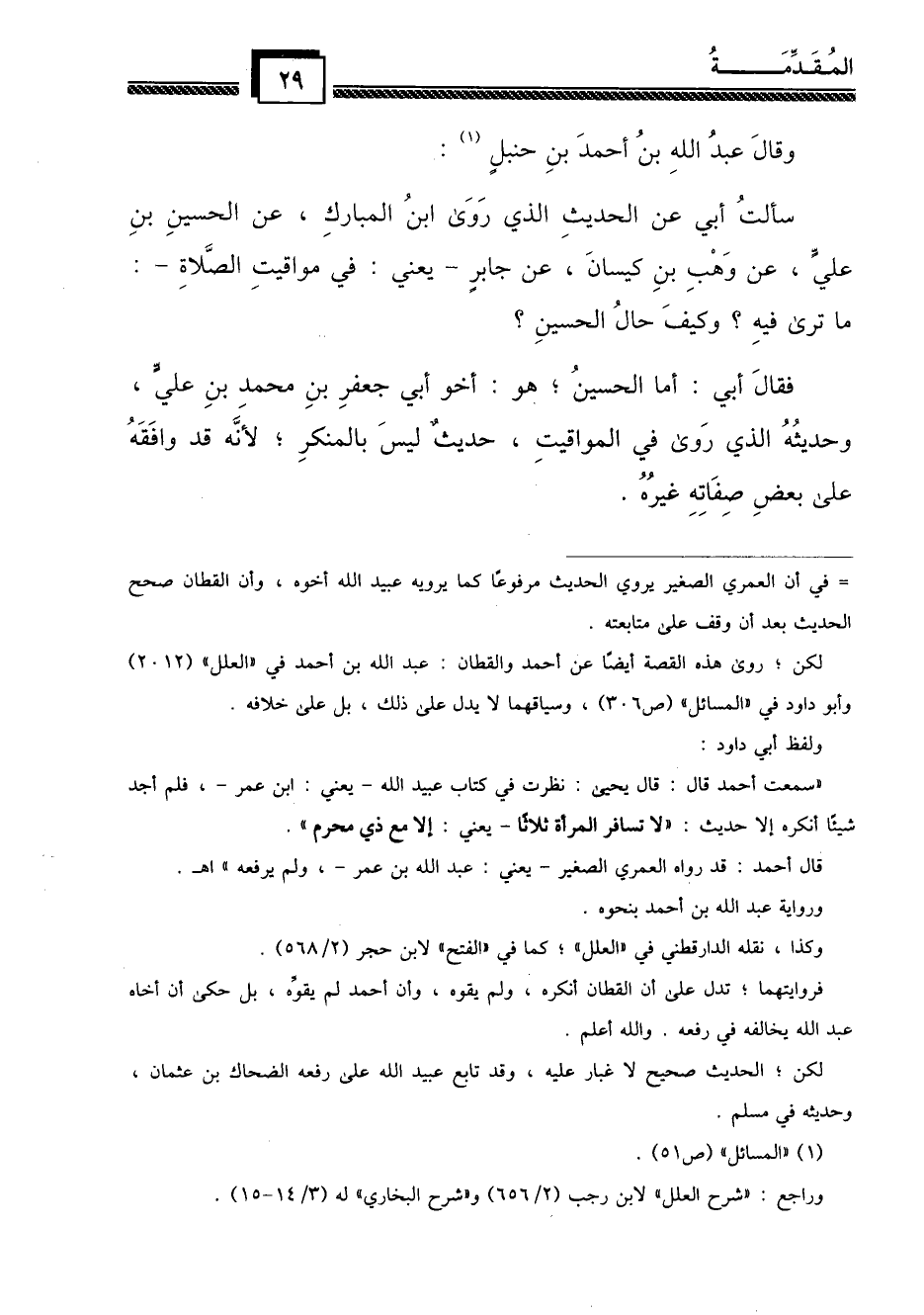 (¬1) "المسائل" (ص 51) ، وراجع "شرح العلل" لابن رجب (2/656) و "شرح البخاري" له (3/14 ـ 15) .
