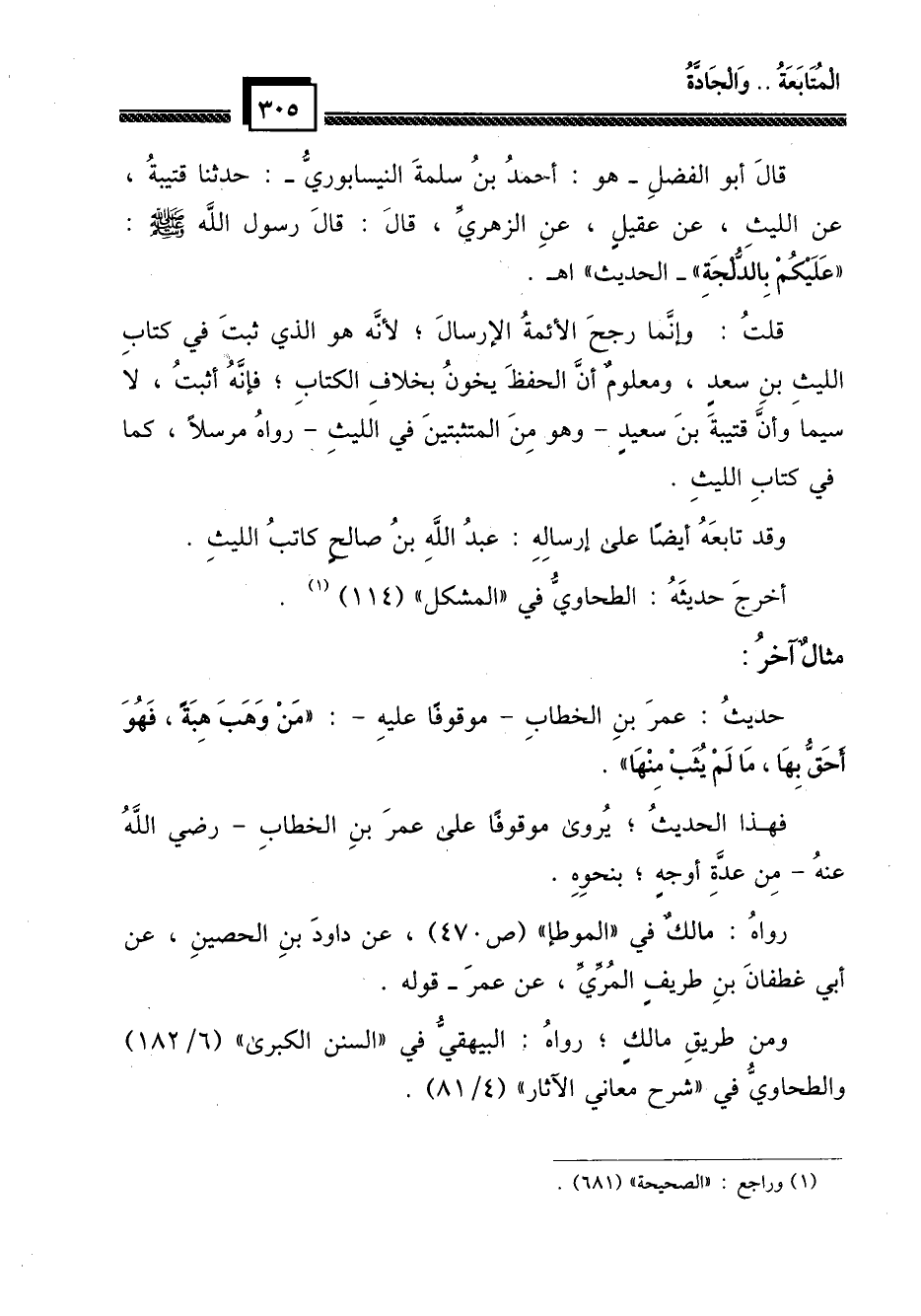 قلت: وإنما رجح الأئمة الإرسال؛ لأنه هو الذي ثبت في كتاب الليث بن سعد، ومعلوم أن الحفظ يخون بخلاف الكتاب؛ فإنه أثبت، لاسيما وأن قتيبة بن سعيد ـ وهو من المتثبتين في الليث ـ رواه مرسلاً، كما في كتاب الليث.