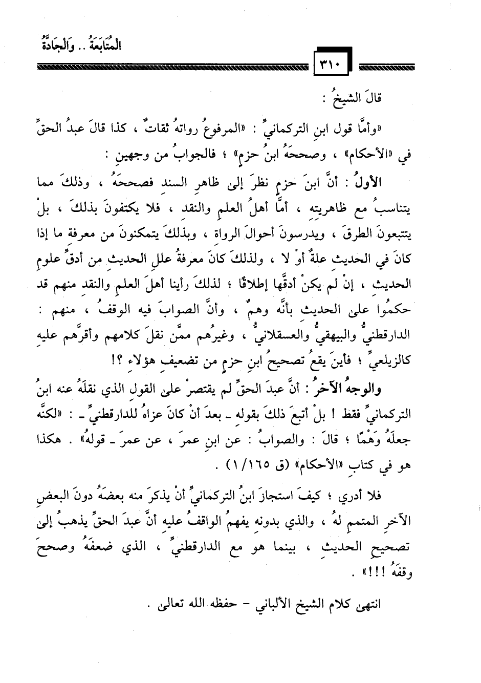 فلا أدري؛ كيف استجاز ابن التركماني أن يذكر منه بعضه دون البعض الآخر المتمم له، والذي بدونه يفهم الواقف عليه أن عبد الحق يذهب إلى تصحيح الحديث، بينما هو مع الدارقطني، الذي ضعفه