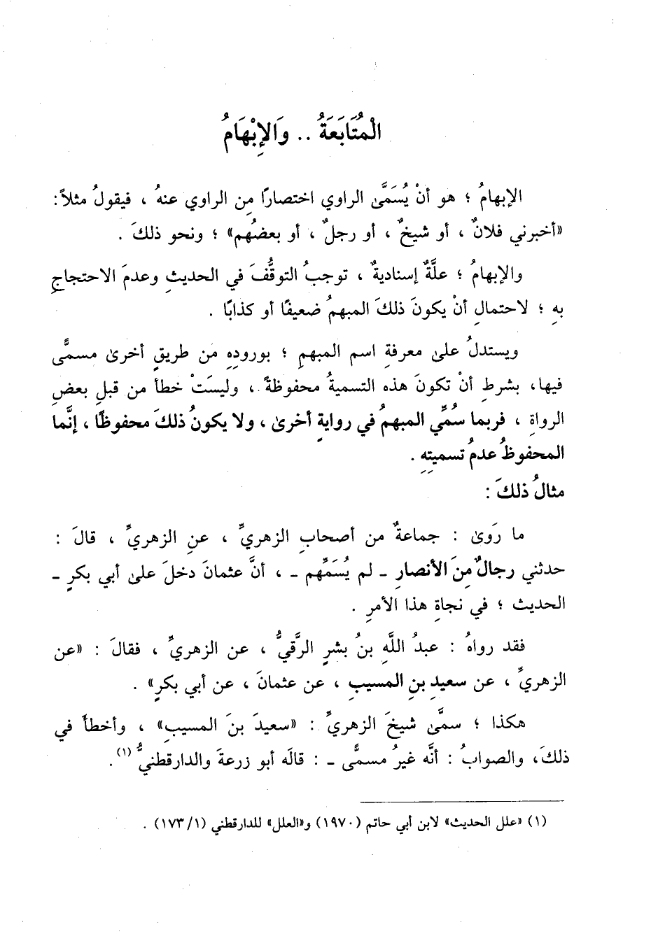 والإبهام؛ علة إسنادية، توجب التوقف في الحديث وعدم الاحتجاج به؛ لاحتمال أن يكون ذلك المبهم ضعيفاً أو كذاباً.