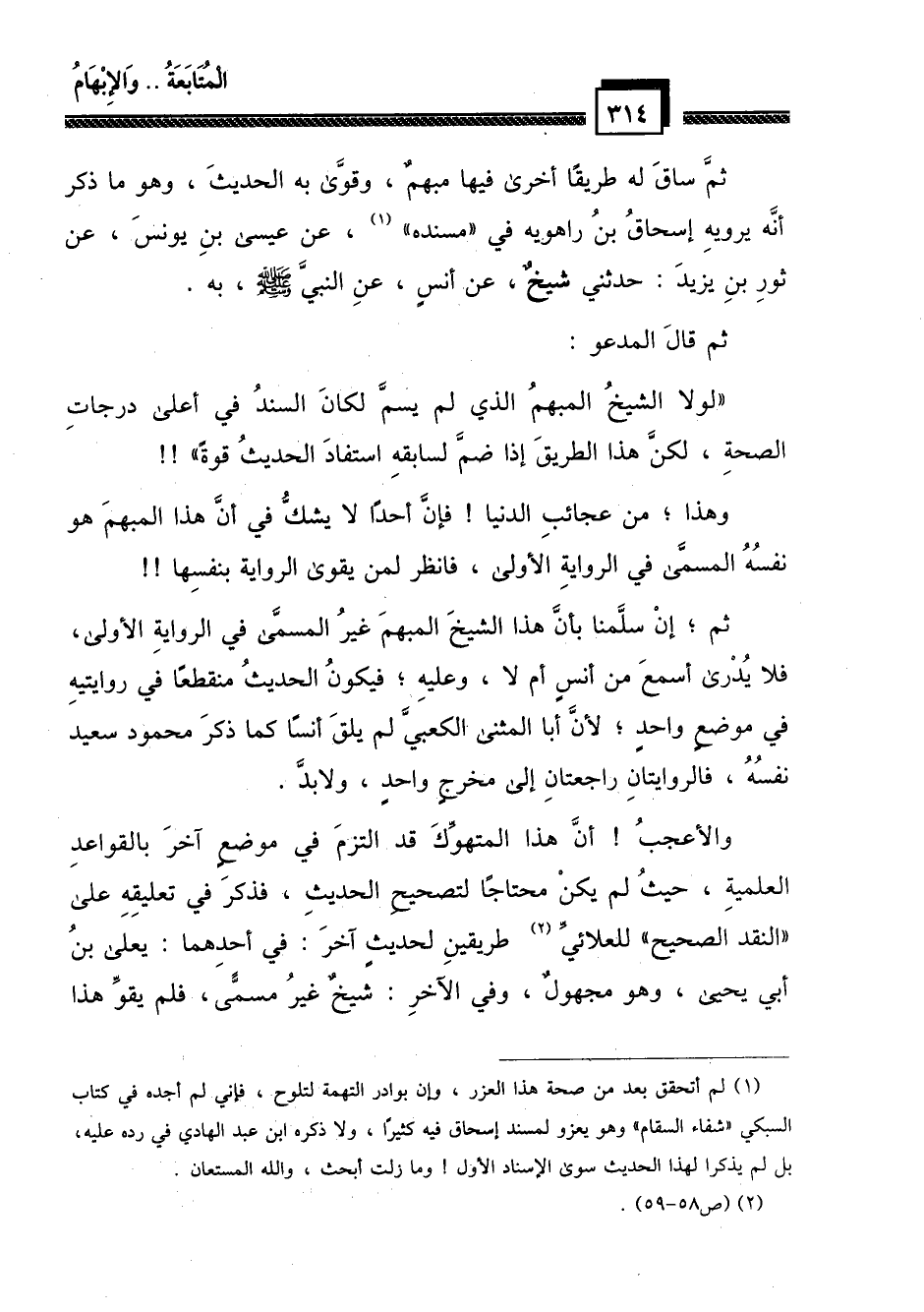 والأعجب! أن هذا المتهم قد التزم في موضع آخر بالقواعد العلمية، حيث لم يكن محتاجاً لتصحيح الحديث، فذكر في تعليقه على " النقد الصحيح " للعلائي (¬2) طريقين لحديث آخر: في أحدهما: يعلى بن أبي يحيى، وهو مجهول، وفي الآخر: شيخ غير مسمى، فلم يقو هذا