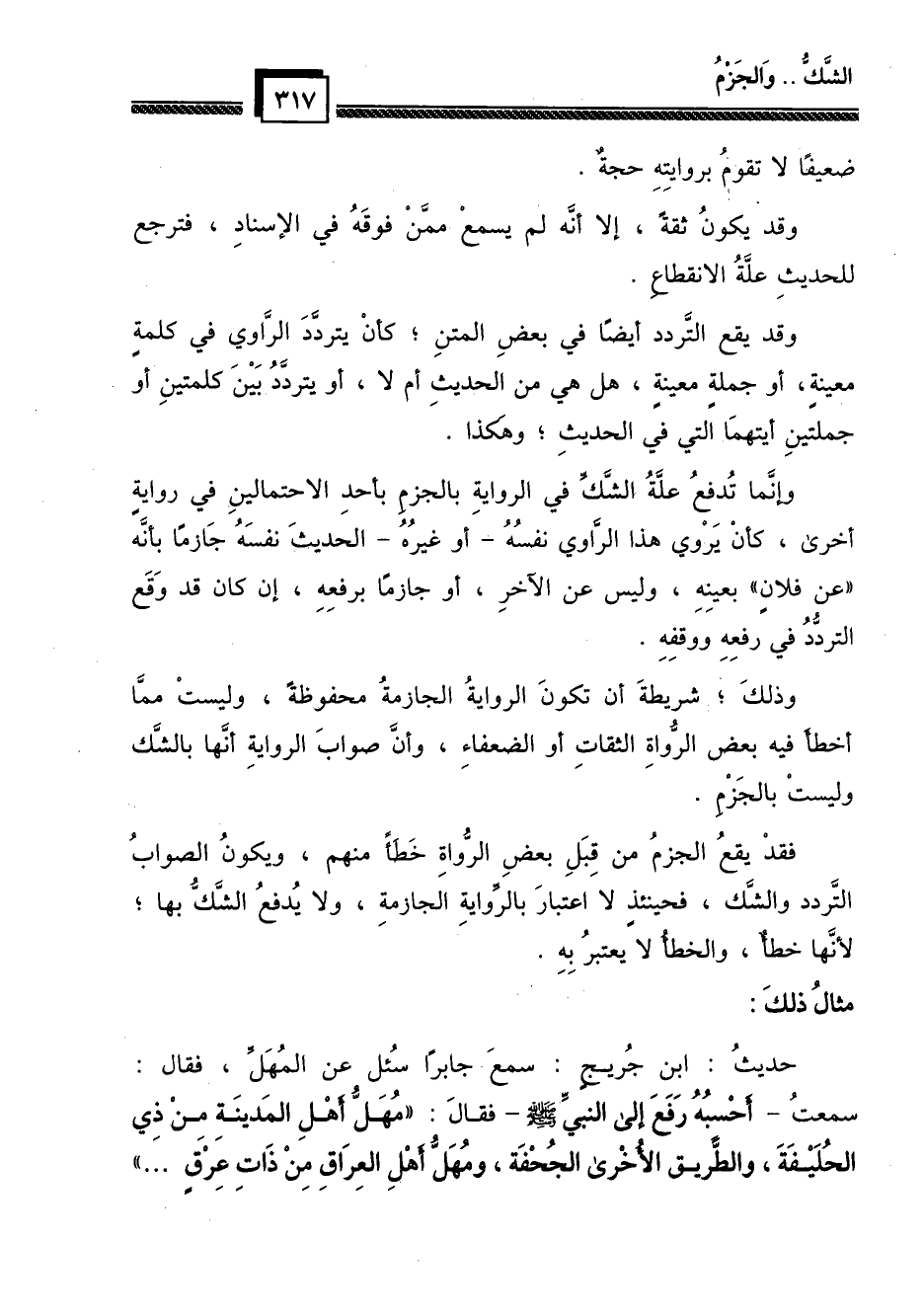 وإنما تُدفع علة الشك في الرواية بالجزم بأحد الاحتمالين في رواية أخرى، كأن يروي هذا الراوي نفسه