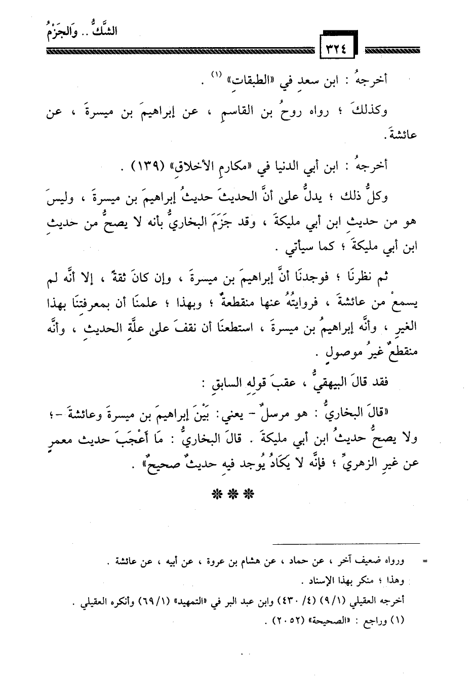 ثم نظرنا؛ فوجدنا أن إبراهيم بن ميسرة، وإن كان ثقة، إلا أنه لم يسمع من عائشة، فروايته عنها منقطعة؛ وبهذا؛ علمنا أن بمعرفتنا بهذا الغير وأنه إبراهيم بن ميسرة، استطعنا أن نقف على علة الحديث، وأنه منقطع غير موصول.