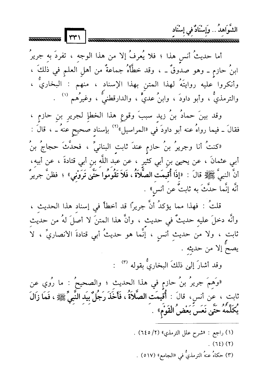 قلت: فهذا مما يؤكد أن جريراً قد أخطأ في إسناد هذا الحديث وأنه دخل عليه حديث في حديث، وأن هذا المتن لا أصل له من حديث ثابت، ولا من حديث أنس، إنما هو حديث أبي قتادة الأنصاري، لا يصح إلا من حديثه.