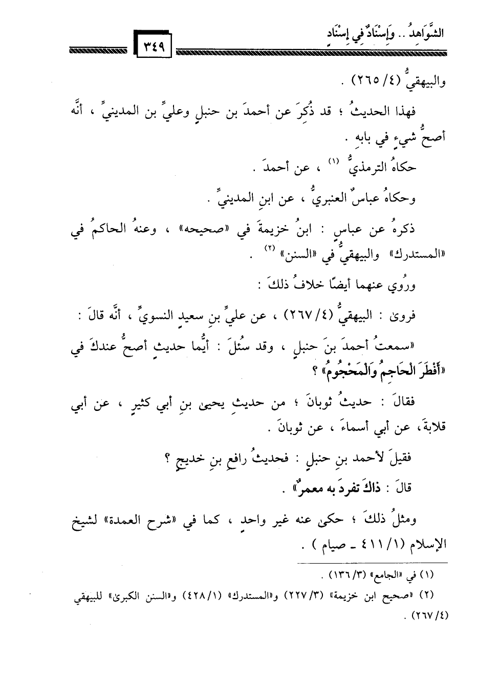 فروى البيهقي (4/267) ، عن علي بن سعيد النسوي، أنه قال: " سمعت أحمد بن حنبل، وقد سُئل: أيما حديث أصح عندك في " أفطر الحاجم والمحجوم "؟