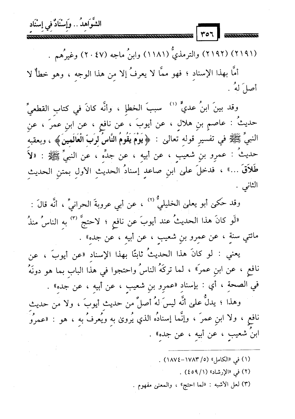 وهذا؛ يدل على أنه ليس له أصل من حديث أيوب، ولا من حديث نافع، ولا ابن عمر، وإنما إسناده الذي يُروى به ويُعرف به، هو: " عمرو بن شعيب، عن أبيه، عن حده ".