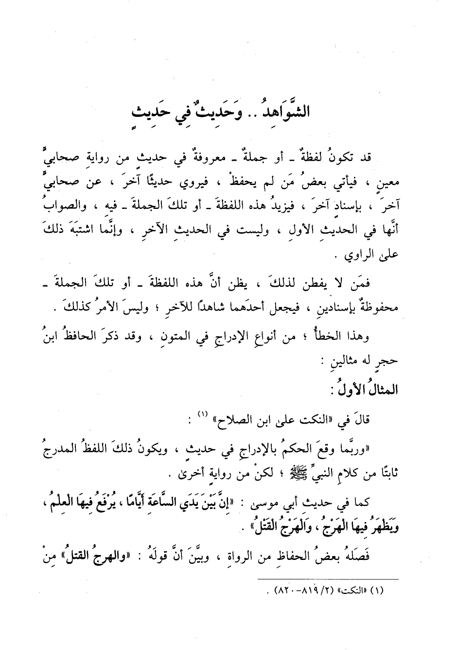 فمن لا يفطن لذلك، يظن أن هذه اللفظة ـ أو تلك الجملة ـ محفوظة بإسنادين، فيجعل أحدهما شاهداً للآخر؛ وليس الأمر كذلك.