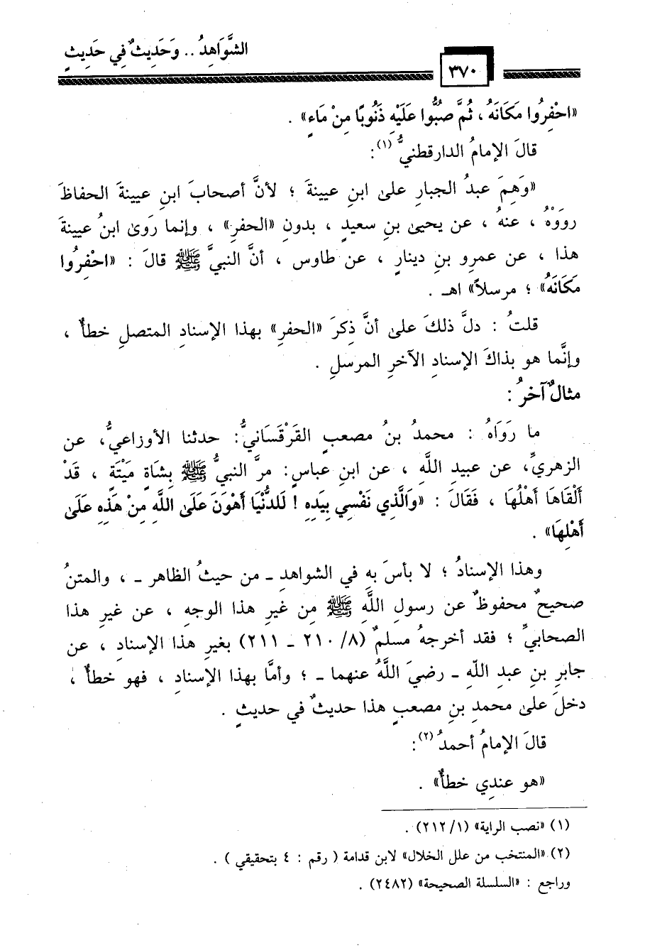 وهذا الإسناد؛ لا بأس به في الشواهد ـ من حيث الظاهر ـ والمتن صحيح محفوظ عن رسول الله - صلى الله عليه وسلم - من غير هذا الوجه، عن غير هذا الصحابي؛ فقد أخرجه مسلم (8/210 - 211) بغير هذا الإسناد، عن جابر بن عبد الله ـ رضي الله عنهما ـ؛ وأما بهذا الإسناد، فهو خطأ، دخل على