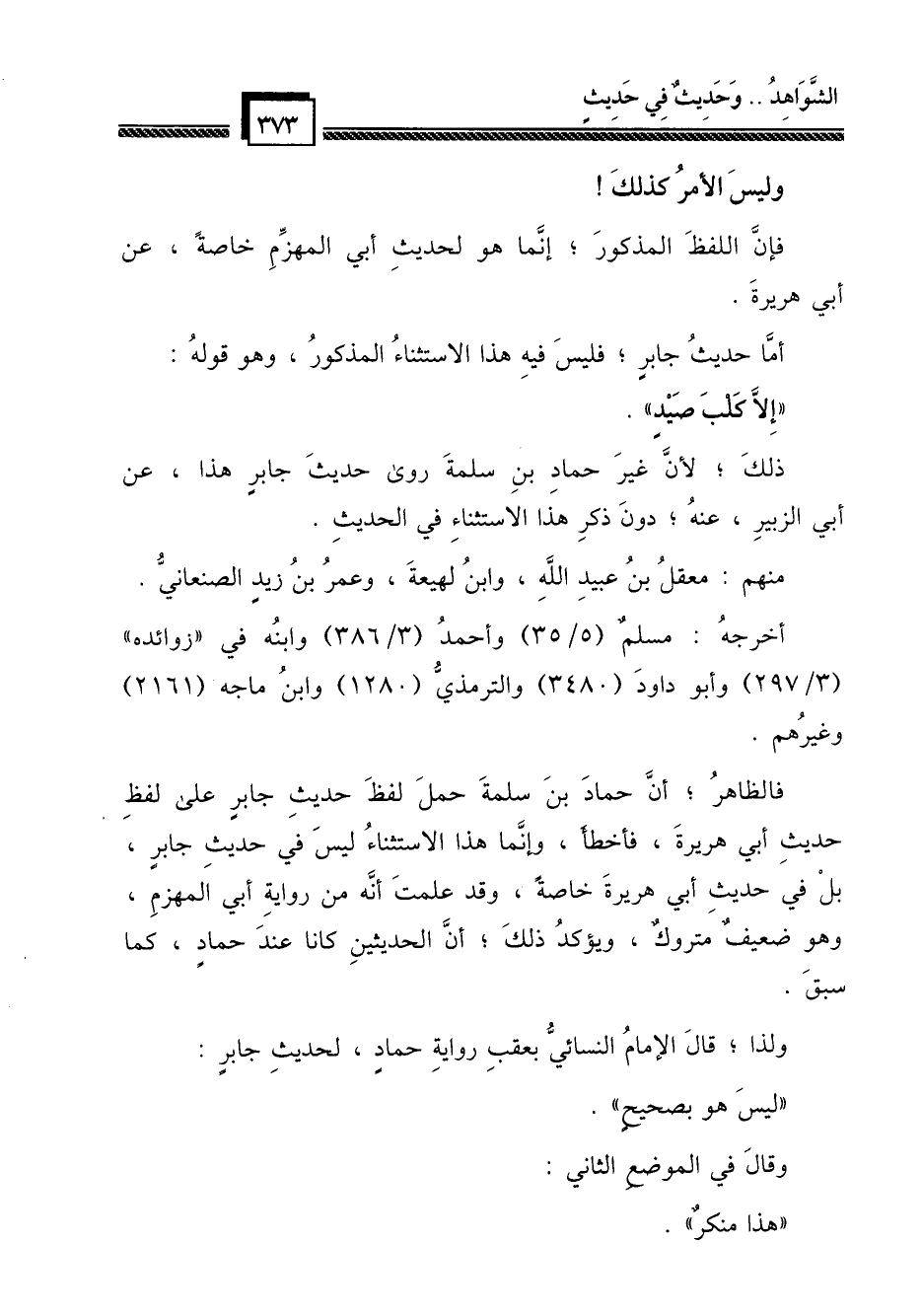 فالظاهر؛ أن حماد بن سلمة حمل لفظ حديث جابر على لفظ حديث أبي هريرة، فأخطأ، وإنما هذا الاستثناء ليس في حديث جابر، بل في حديث أبي هريرة خاصة، وقد علمت أنه من رواية أبي المهزم، وهو ضعيف متروك، ويؤكد ذلك؛ أن الحديثين كانا عند حماد، كما سبق.