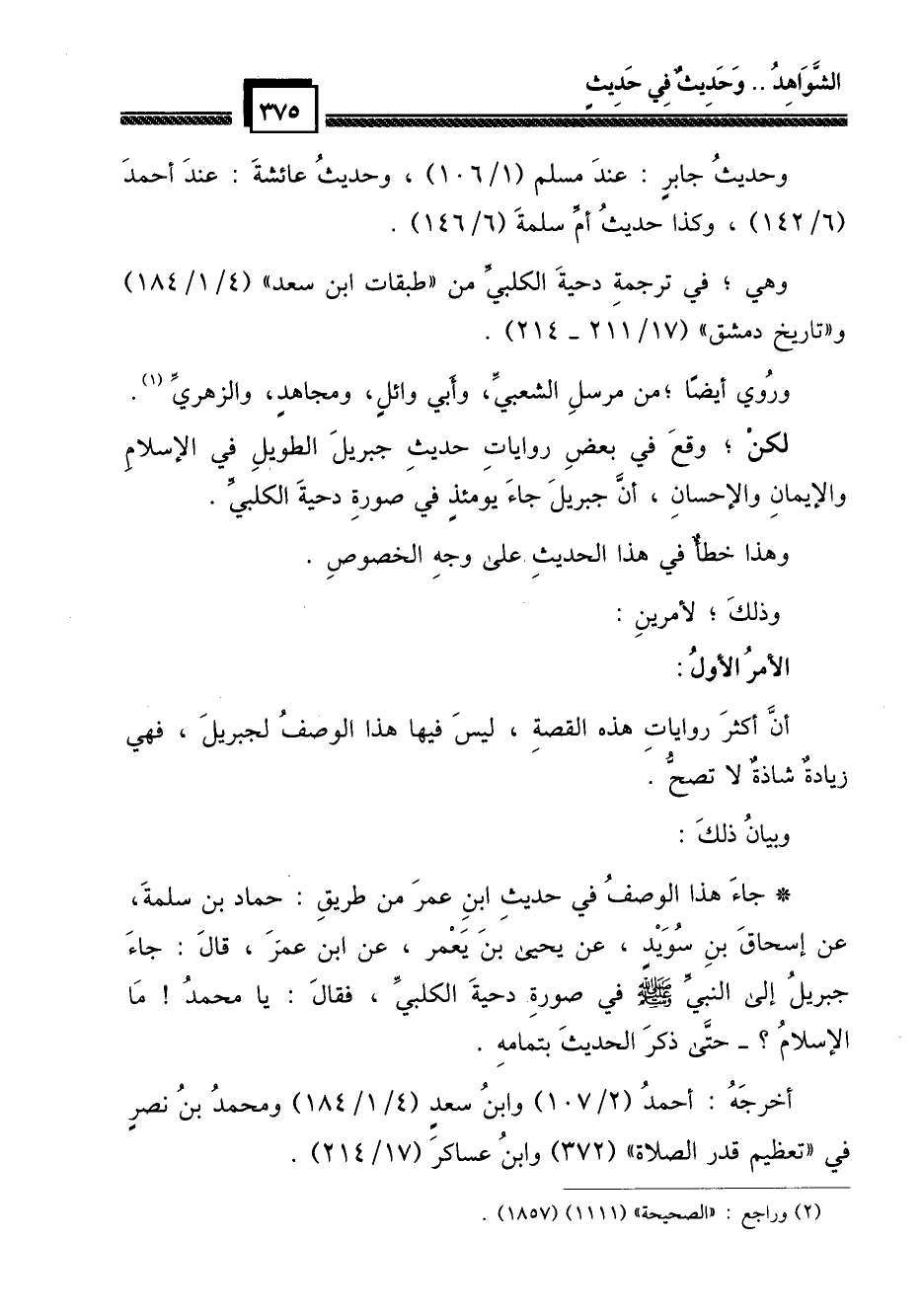 * جاء هذا الوصف في حديث ابن عمر من طريق: حماد بن سلمة، عن إسحاق بن سويد، عن يحيى بن معمر، عن ابن عمر، قال: جاء جبريل إلى النبي - صلى الله عليه وسلم - في صورة دحية الكلبي، فقال: يا محمد! ما الإسلام؟ ـ حتى ذكر الحديث