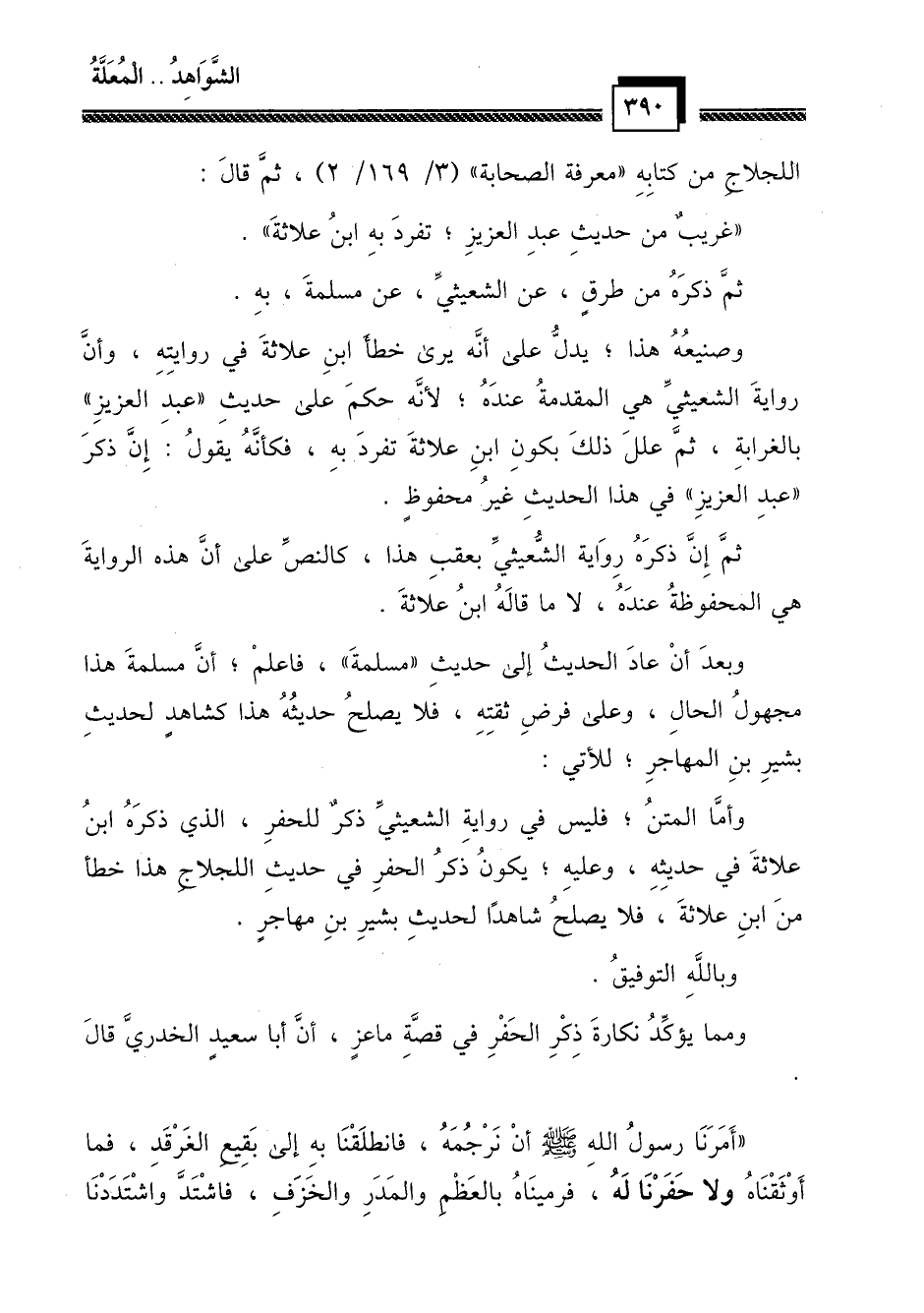 وصنيعة هذا؛ يدل على أنه خطأ ابن علاثة في روايته، وأن رواية الشعيثي هي المقدَّمة عنده، لأنه حكم على حديث " عبد العزيز " بالغرابة، ثم علل ذلك بكون ابن علاثة تفرد به، فكأنه يقول: إن ذكر " عبد العزيز " في هذا الحديث غير محفوظ.