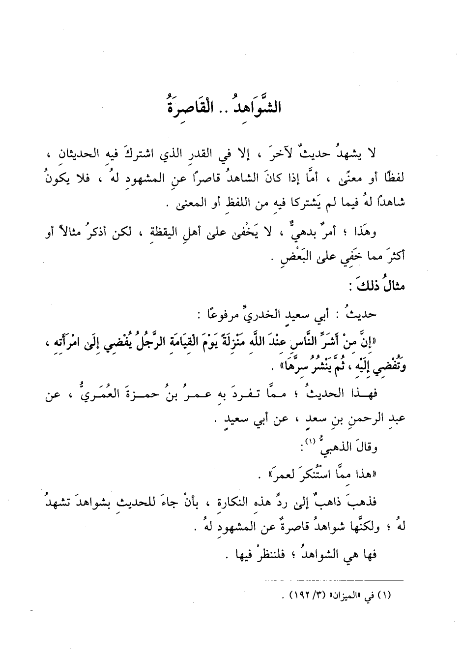 لا يشهد حديث لآخر، إلا في القدر الذي اشترك فيه الحديثان، لفظاً أو معنى، أما إذا كان الشاهد قاصراً على المشهود له، فلا يكون شاهداً له فيما لم يشتركا فيه من اللفظ أو المعنى.