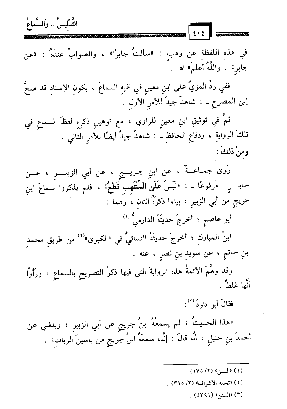 روى جماعة، عن ابن جريج، عن أبي الزبير، عن جابر ـ مرفوعاً ـ: " ليس على المنتهب قطع "، فلم يذكروا سماع ابن جريج من أبي الزبير، بينما ذكره اثنان، وهما: