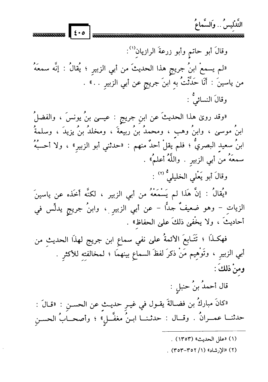 " لم يسمع ابن جريج هذا الحديث من أبي الزبير؛ يُقال: إنه سمعه من ياسين: أنا حَدَّثْتُ به ابن جريج عن أبي الزبير.. ".
