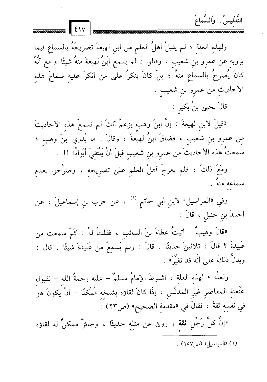 ولهذه العلة؛ لم يقبل أهل العلم من ابن لهيعة تصريحه بالسماع فيما يرويه عن عمرو بن شعيب، وقالوا: لم يسمع ابن لهيعة منه شيئاً، مع أن كان يصرح بالسماع منه، بل كان ينكر على من أنكر عليه سماع هذه الأحاديث من عمرو بن شعيب.