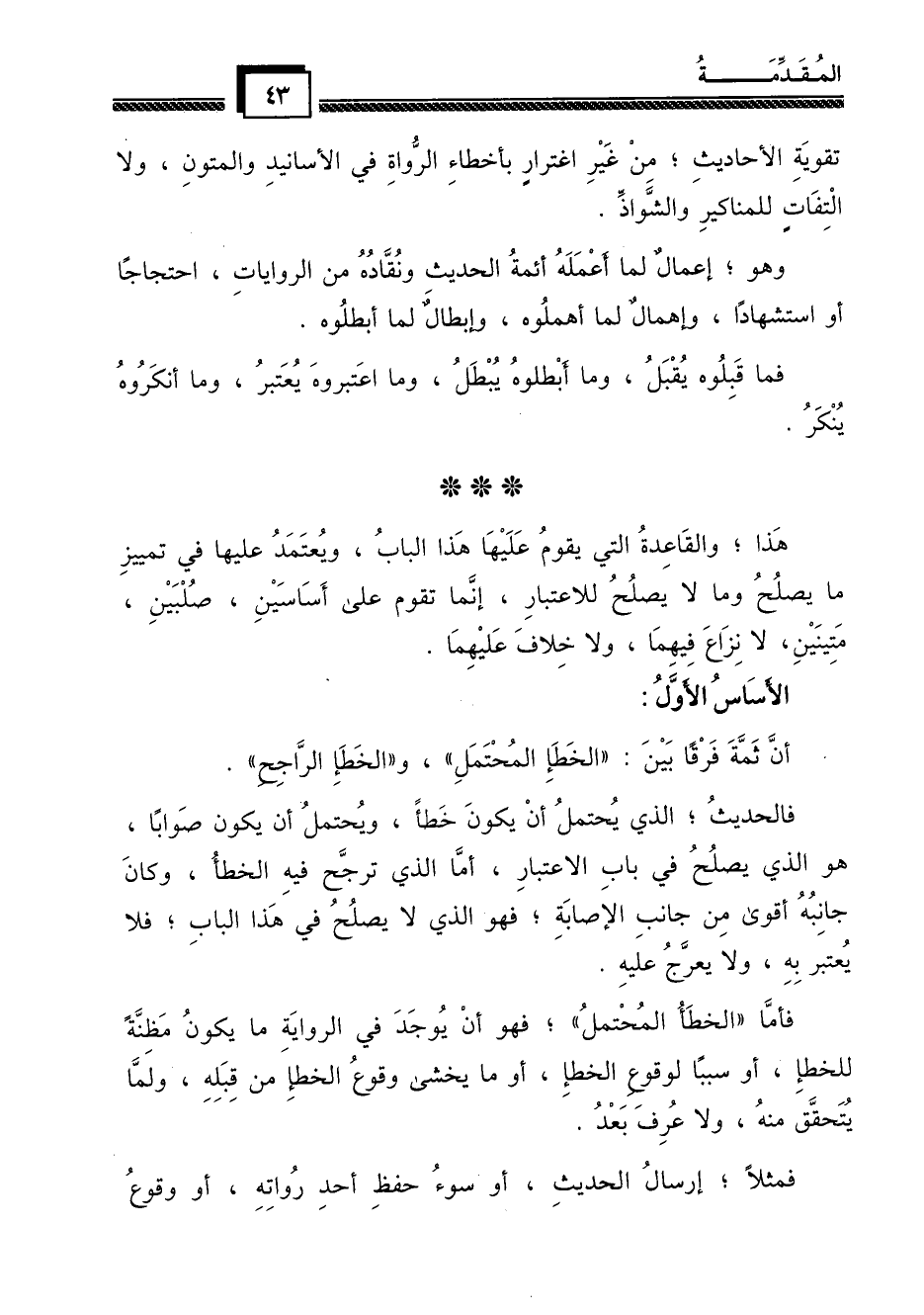 فالحديث؛ الذي يُحتمل أن يكون خطأً، ويُحتمل أن يكون صواباً، هو الذي يصلح في باب الاعتبار، أما الذي ترجَّح فيه الخطأ، وكان جانبه أقوى من جانب الإصابة؛ فهو الذي لا يصلح في هذا الباب؛ فلا يُعتبر به، ولا يعرج إليه.