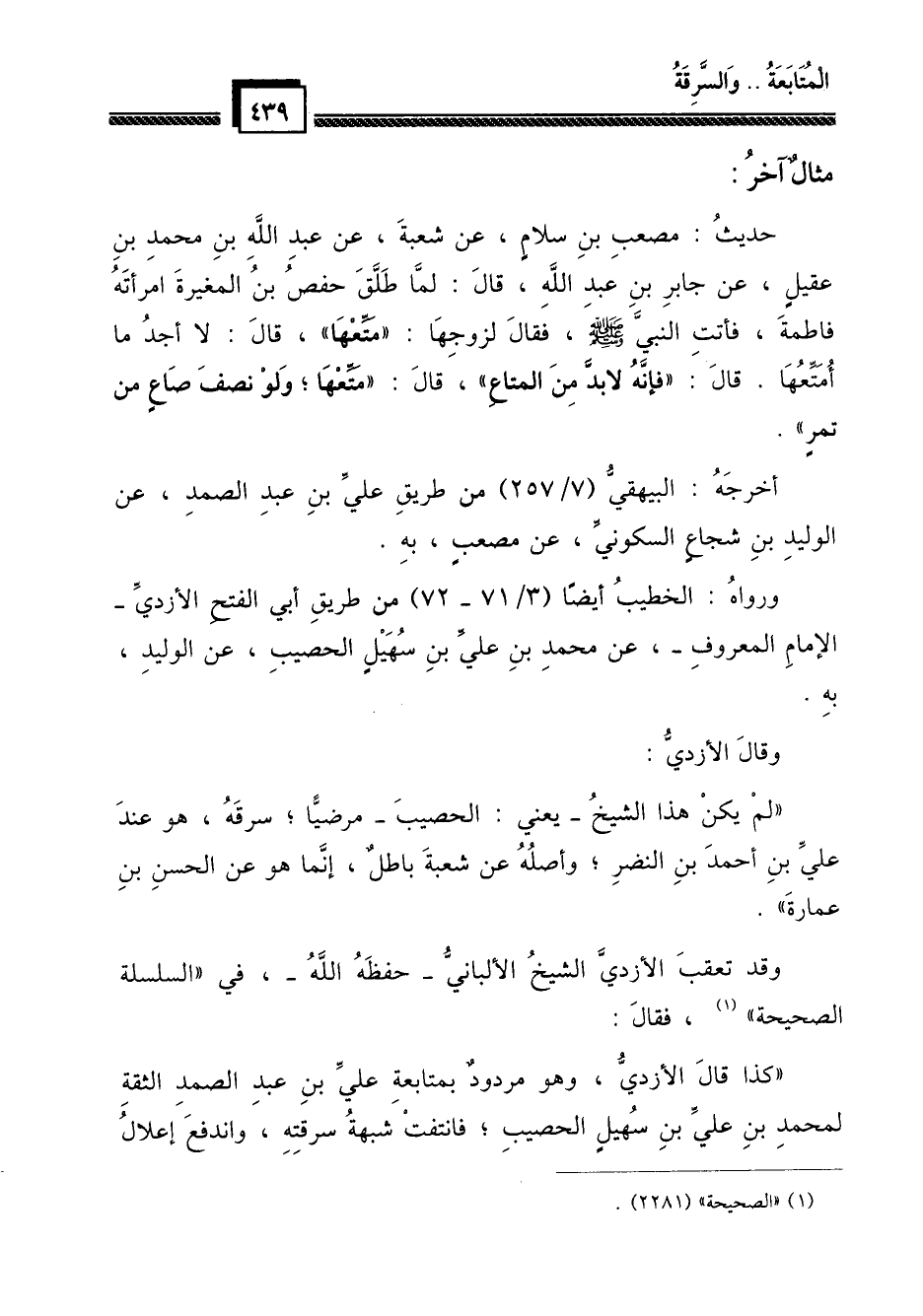 " كذا قال الأزدي، وهو مردود بمتابعة علي بن عبد الصمد الثقة لمحمد بن علي بن سهيل الحصيب؛ فانتفت شبهة سرقته، واندفع إعلال