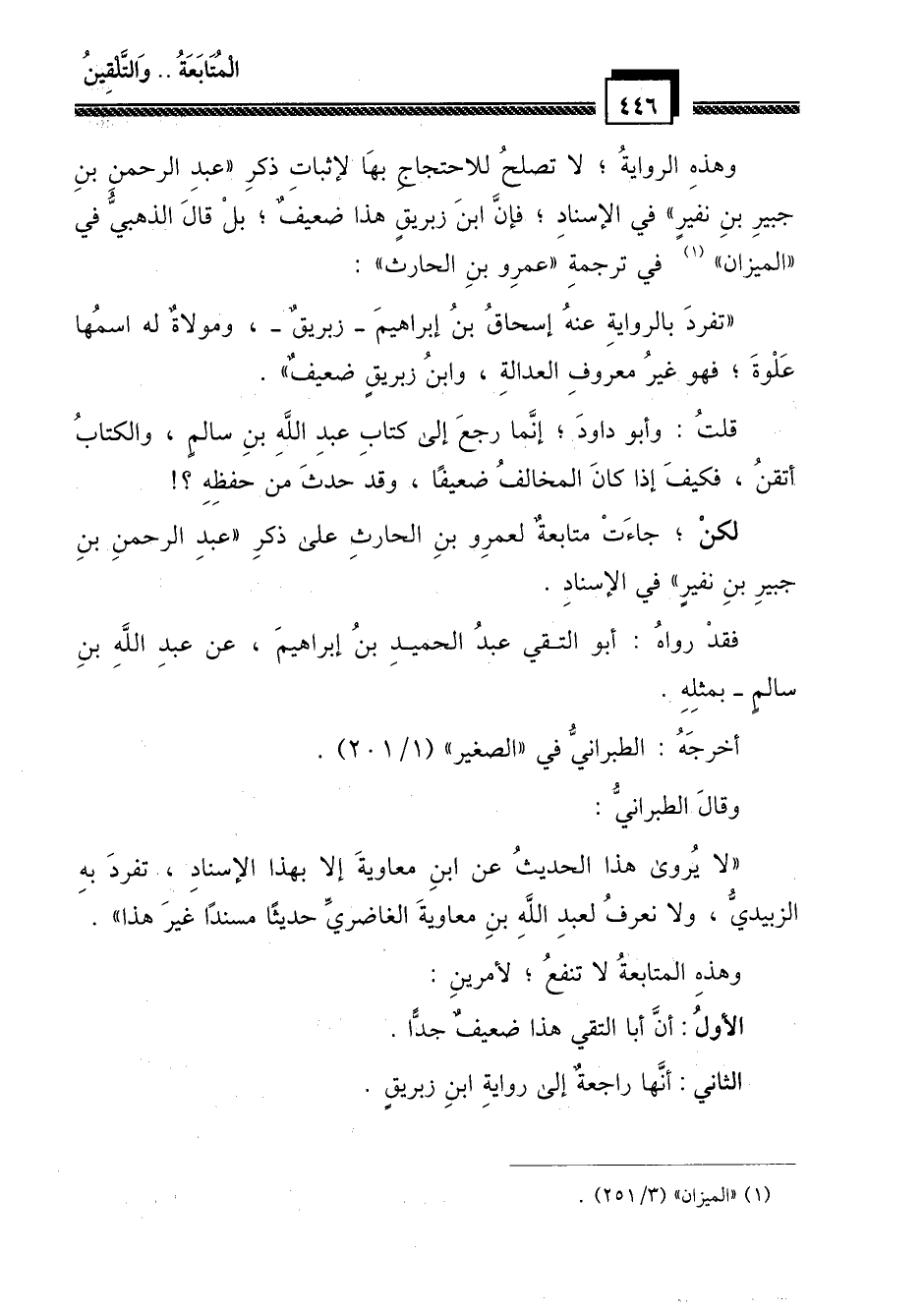 وهذه الرواية؛ لا تصلح للاحتجاج بها لإثبات ذكر " عبد الرحمن بن جبير بن نفير " في الإسناد؛ فإن ابن زبريق هذا ضعيف؛ بل قال الذهبي في " الميزان " (¬1) في ترجمة " عمرو بن الحارث ":