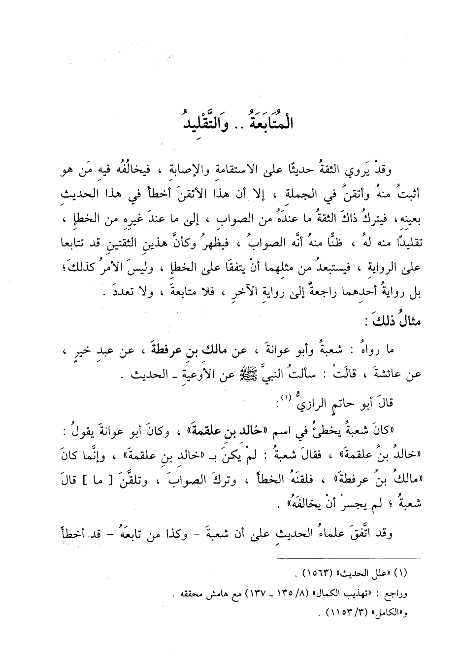 وقد يروى الثقة حديثاً على الاستقامة والإصابة، فيخالفه فيه من هو أثبت منه وأتقن في الجملة، إلا أن هذا الأتقن أخطأ في هذا الحديث بعينه، فيترك ذاك الثقة ما عنده من الصواب، إلى ما عند غيره من الخطأ، تقليداً منه له، ظناً منه أنه الصواب، فيظهر وكأن هذين الثقتين قد تتابعا على الرواية، فيستبعد ما مثلهما أن يتفقا على الخطأ، وليس الأمر كذلك؛ بل رواية أحدهما راجعة إلى رواية الآخر، فلا متابعة، ولا تعدد.