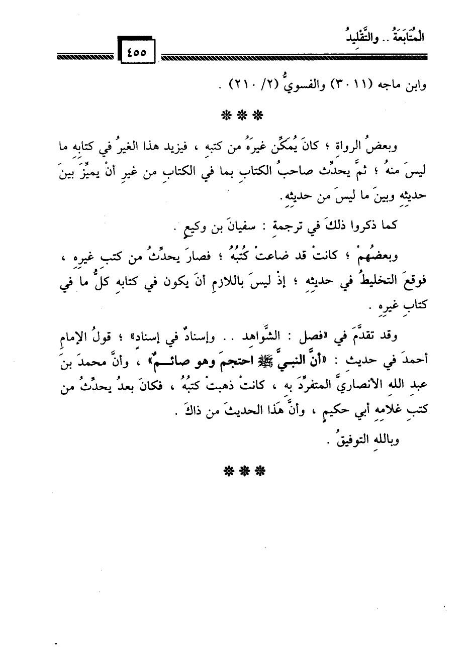 وقد تقدم في " فصل: الشواهد.. وإسناد في إسناد "؛ قول الإمام أحمد في حديث: " أن النبي - صلى الله عليه وسلم - احتجم وهو صائم "، وأن محمد بن عبد الله الأنصاري المتفرد به، كانت ذهبت كتبه، فكان بعد يحدث من كتب غلامه أبي حكيم، وأن هذا الحديث من ذاك.