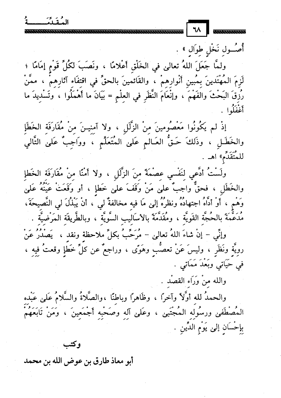 ولست أدعي لنفسي عصمة من الزلل، ولا أمناً من مفارقة الخطأ والخطل، فحق واجب على من وقف على خطأ، أو وقعت عينه على وهم، أو أداه اجتهاده ونظره إلى ما فيه مخالفة لي، أن يبذل لي النصيحة، مدعمة بالحجة القوية، ومقدَّمة بالأساليب السوية، وبالطريقة المرضية.