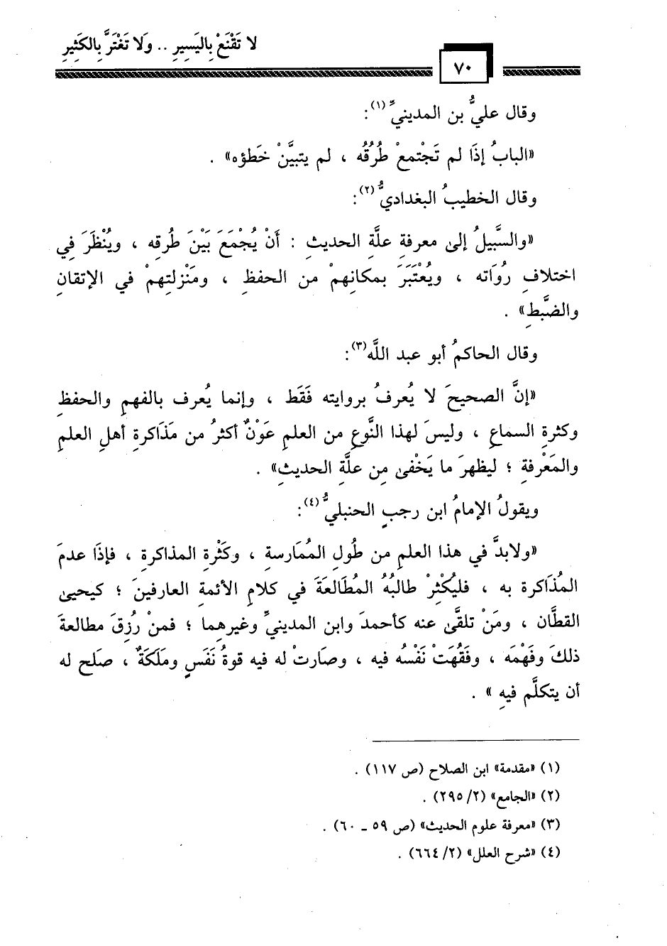 "ولابد في هذا العلم من طول الممارسة، وكثرة المذاكرة، فإذا عدم المذاكرة به، فليكثر طالبه المطالعة في كلام الأئمة العارفين؛ كيحيى القطان , ومن تلقى عنه كأحمد وابن المديني وغيرهما؛ فمن رُزق مطالعة ذلك وفهمه، وفقُهَت نفسه فيه، وصارت له فيه قوة نفس وملكة، صلُح له أن يتكلم فيه".