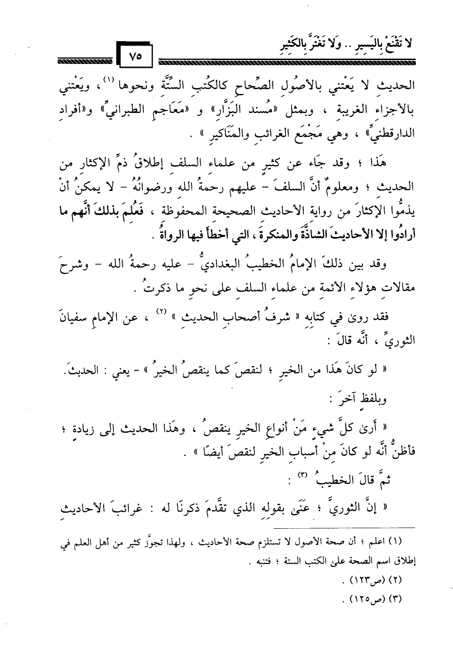 هذا؛ وقد جاء عن كثير من علماء السلف إطلاق ذم الإكثار من الحديث؛ ومعلوم أن السلف ـ عليهم رحمة الله ورضوانه ـ لا يمكن أن يذموا الإكثار من رواية الأحاديث الصحيحة المحفوظة، فعلم بذلك أنهم ما أرادوا إلا الأحاديث الشاذة والمنكرة، التي أخطأ فيها الرواة.