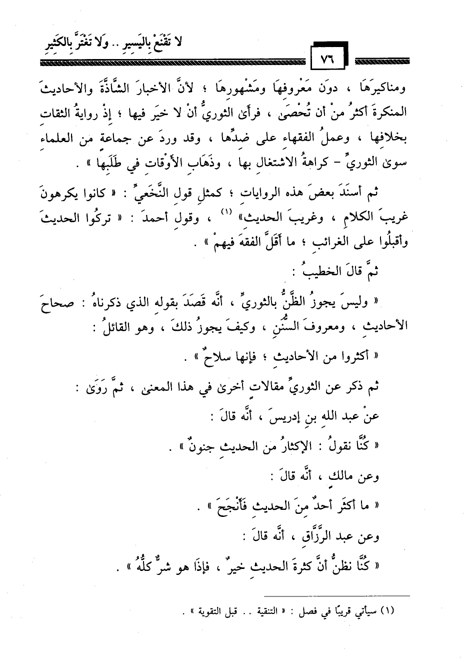 ومناكيرها، دون معروفها ومشهورها؛ لأن الأخبار الشاذة والأحاديث المنكرة أكثر من أن تحصى، فرأى الثوري أن لا خير فيها؛ إذ رواية الثقات بخلافها، وعمل الفقهاء على ضدها، وقد ورد عن جماعة من العلماء سوى الثوري ـ كراهة الاشتغال بها، وذهاب الأوقات في طلبها".