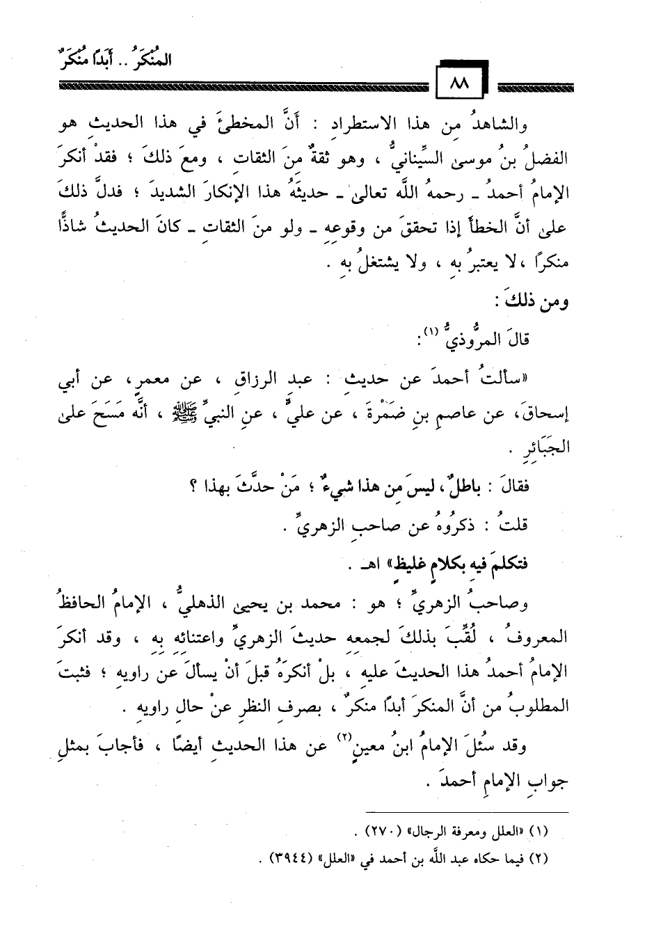 والشاهد من هذا الاستطراد: أن المخطئ في هذا الحديث هو الفضل بن موسى السيناني وهو ثقة من الثقات، ومع ذلك؛ فقد أنكر الإمام أحمد ـ رحمه الله تعالى ـ حديثه هذا الإنكار الشديد؛ فدل ذلك على أن الخطأ إذا تحقق من وقوعه ـ ولو من الثقات ـ كان الحديث شاذاً منكراً، لا يُعتبر به، ولا يُشتغل به.