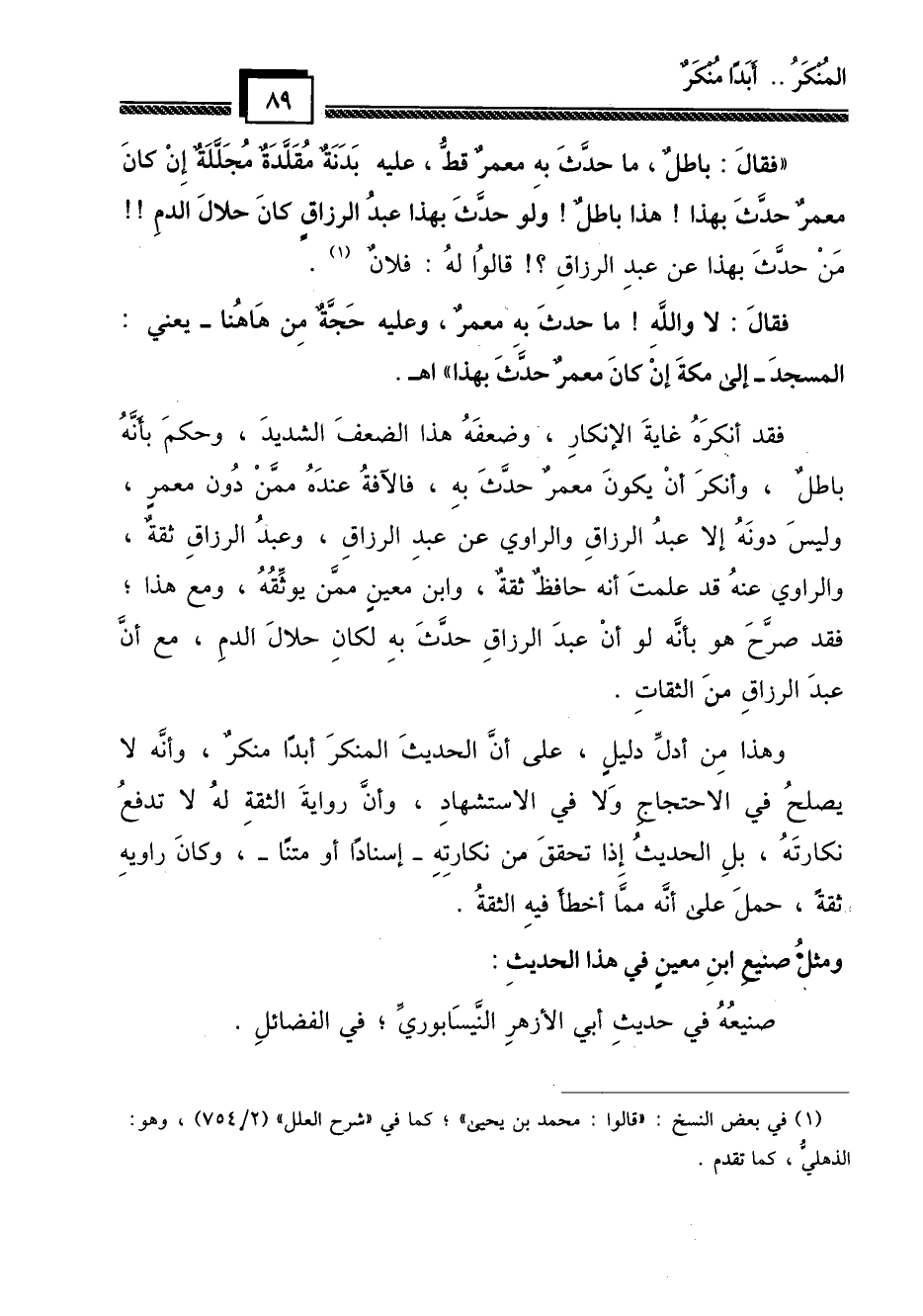 فقد أنكره غاية الإنكار، وضعفه هذا الضعف الشديد، وحكم بأنه باطل، وأنكر أن يكون معمر حدث به، فالآفة عنده ممن دون معمر، وليس دونه إلا عبد الرزاق والراوي عن عبد الرزاق، وعبد الرزاق ثقة، والراوي عنه قد علمتَ أنه حافظ ثقة، وابن معين ممن يوثقه، ومع هذا؛ فقد صرح هو بأنه لو أن عبد الرزاق حدث به لكان حلال الدم، مع أن عبد الرزاق من الثقات.