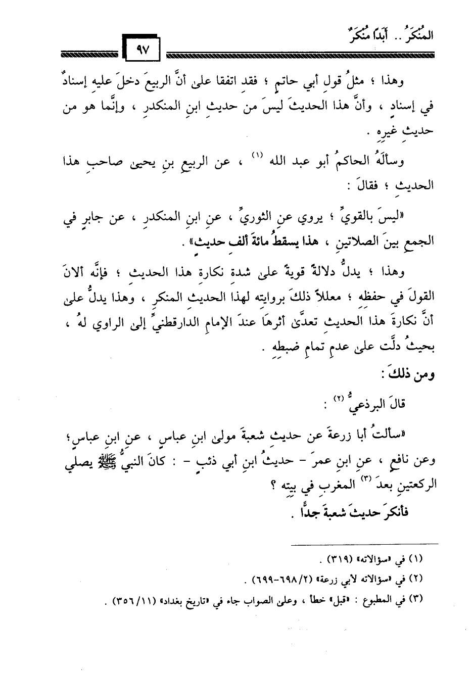 وهذا؛ مثل قول أبي حاتم؛ فقد اتفقا على أن الربيع دخل عليه إسناد في إسناد، وأن الحديث ليس من حديث ابن المنكدر، وإنما هو من حديث غيره.