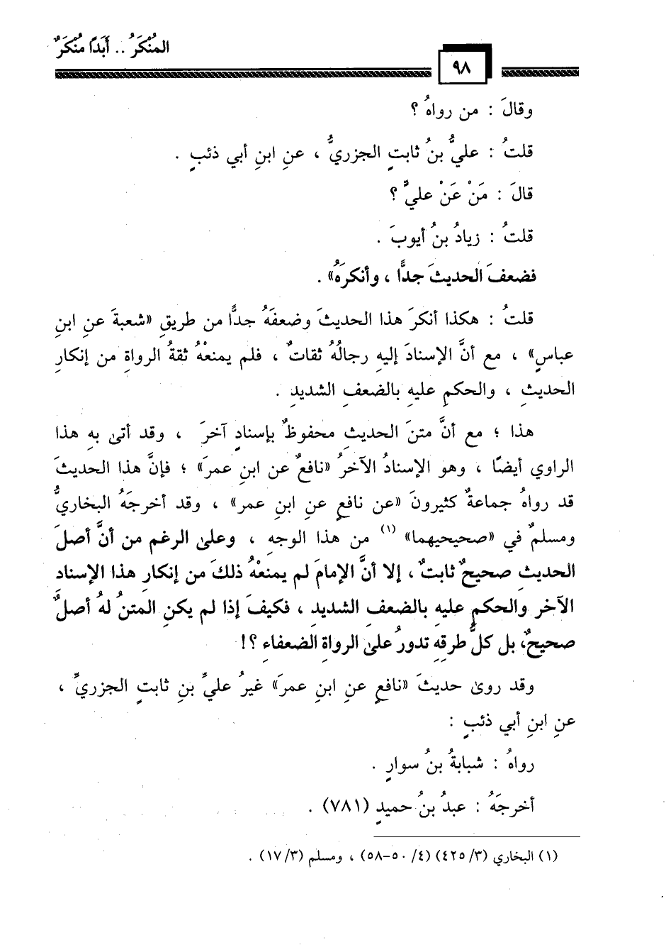 من هذا الوجه، وعلى الرغم من أن أصل الحديث صحيح ثابت، إلا أن الإمام لم يمنعه ذلك من إنكار هذا الإسناد الآخر والحكم عليه بالضعف الشديد، فكيف إذا لم يكن المتن له أصل صحيح، بل كل طرقه تدور على الرواة الضعفاء؟!