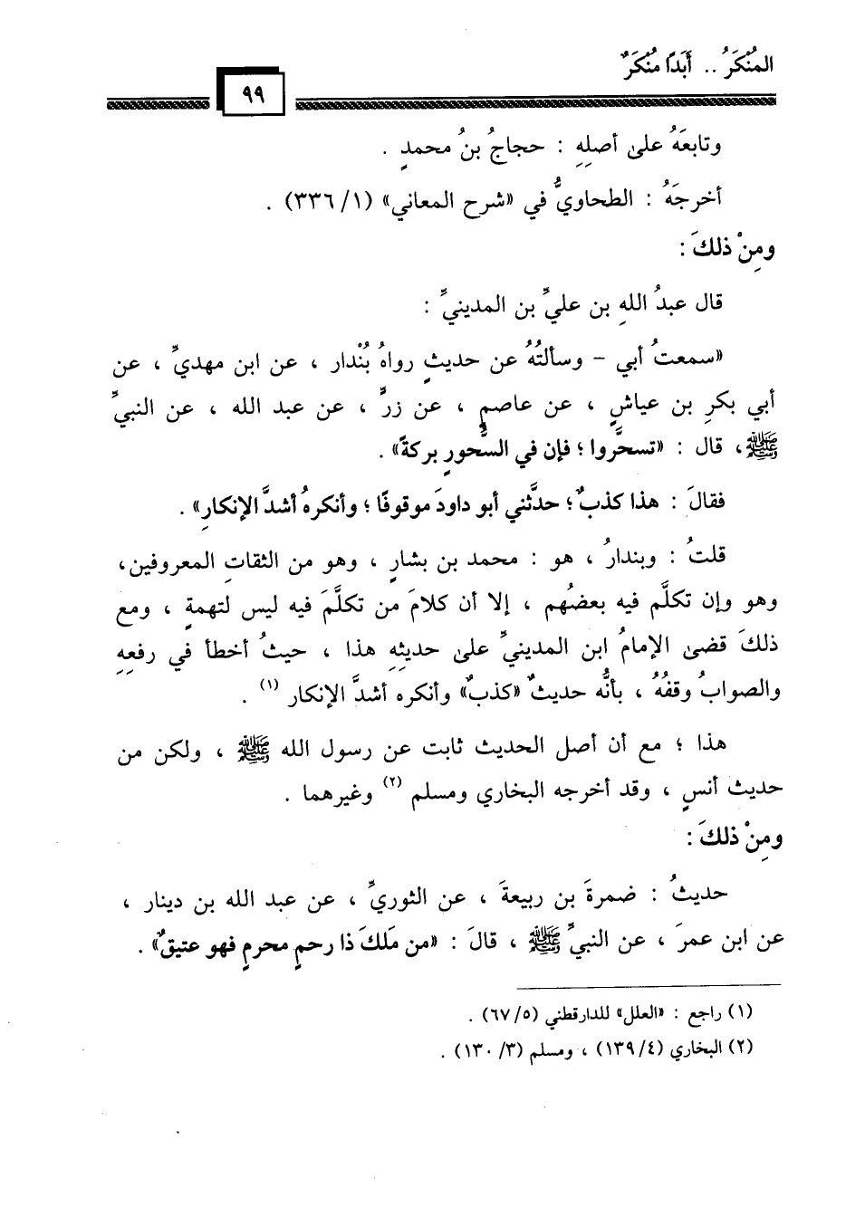 قلت: وبندار، هو محمد بن بشار، وهو من الثقات المعروفين، وهو وإن تكلم فيه بعضهم، إلا أن كلام من تكلم فيه ليس لتهمة، ومع ذلك قضى الإمام ابن المديني على حديثه هذا، حيث أخطأ في رفعه والصواب وقفه، بأنه حديث " كذب " وأنكره أشد الإنكار (¬1) .