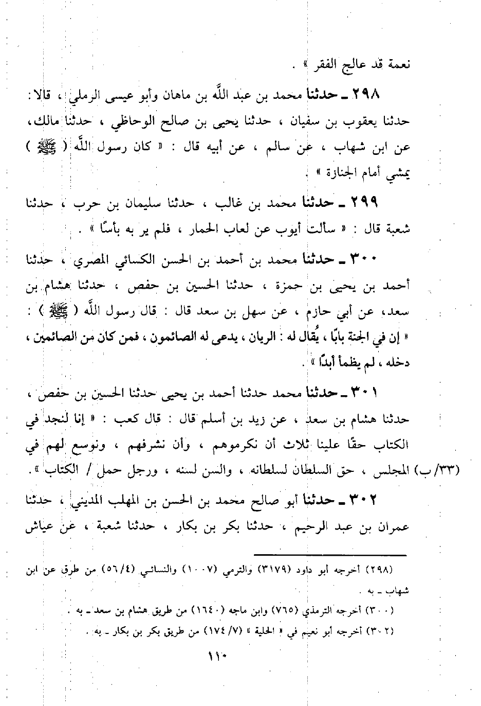 283 - حَدَّثَنَا مُحَمَّدٌ، حَدَّثَنَا أَحْمَدُ بْنُ يَحْيَى، حَدَّثَنَا الْحُسَيْنُ بْنُ حَفْصٍ، حَدَّثَنَا هِشَامُ بْنُ سَعْدٍ، عَنْ زَيْدِ بْنِ أَسْلَمَ قَالَ: قَالَ كَعْبٌ: «إِنَّا لَنَجِدُ فِي الْكِتَابِ §حَقًّا عَلَيْنَا ثَلَاثًا أَنْ نُكْرِمَهُمْ، وَأَنْ نُشَرِّفَهُمْ، وَنُوَسِّعَ لَهُمْ فِي الْمَجْلِسِ، حَقَّ السُّلْطَانِ لِسُلْطَانِهِ، وَالسِّنِّ لِسِنِّهِ، وَرَجُلٍ حَمَلَ الْكِتَابَ»
