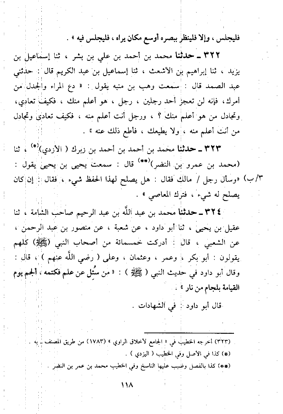 305 - حَدَّثَنَا مُحَمَّدُ بْنُ عَبْدِ اللَّهِ بْنِ عَبْدِ الرَّحِيمِ، صَاحِبُ الشَّامَةِ، ثنا عَقِيلُ بْنُ يَحْيَى، ثنا أَبُو دَاوُدَ، عَنْ شُعْبَةَ، عَنْ مَنْصُورِ بْنِ عَبْدِ الرَّحْمَنِ، عَنِ الشَّعْبِيِّ قَالَ: أَدْرَكْتُ خَمْسَمِائَةٍ مِنْ أَصْحَابِ النَّبِيِّ صَلَّى اللَّهُ عَلَيْهِ وَسَلَّمَ كُلُّهُمْ يَقُولُونَ: أَبُو بَكْرٍ، وَعُمَرُ، وَعُثْمَانُ، وَعَلِيٌّ رَضِيَ اللَّهُ عَنْهُمْ قَالَ: وَقَالَ أَبُو دَاوُدَ فِي حَدِيثِ النَّبِيِّ صَلَّى اللَّهُ عَلَيْهِ وَسَلَّمَ: «§مَنْ سُئِلَ عَنْ عِلْمٍ فَكَتَمَهُ، أُلْجِمَ يَوْمَ الْقِيَامَةِ بِلِجَامٍ مِنْ نَارٍ» قَالَ أَبُو دَاوُدَ: فِي الشَّهَادَاتِ