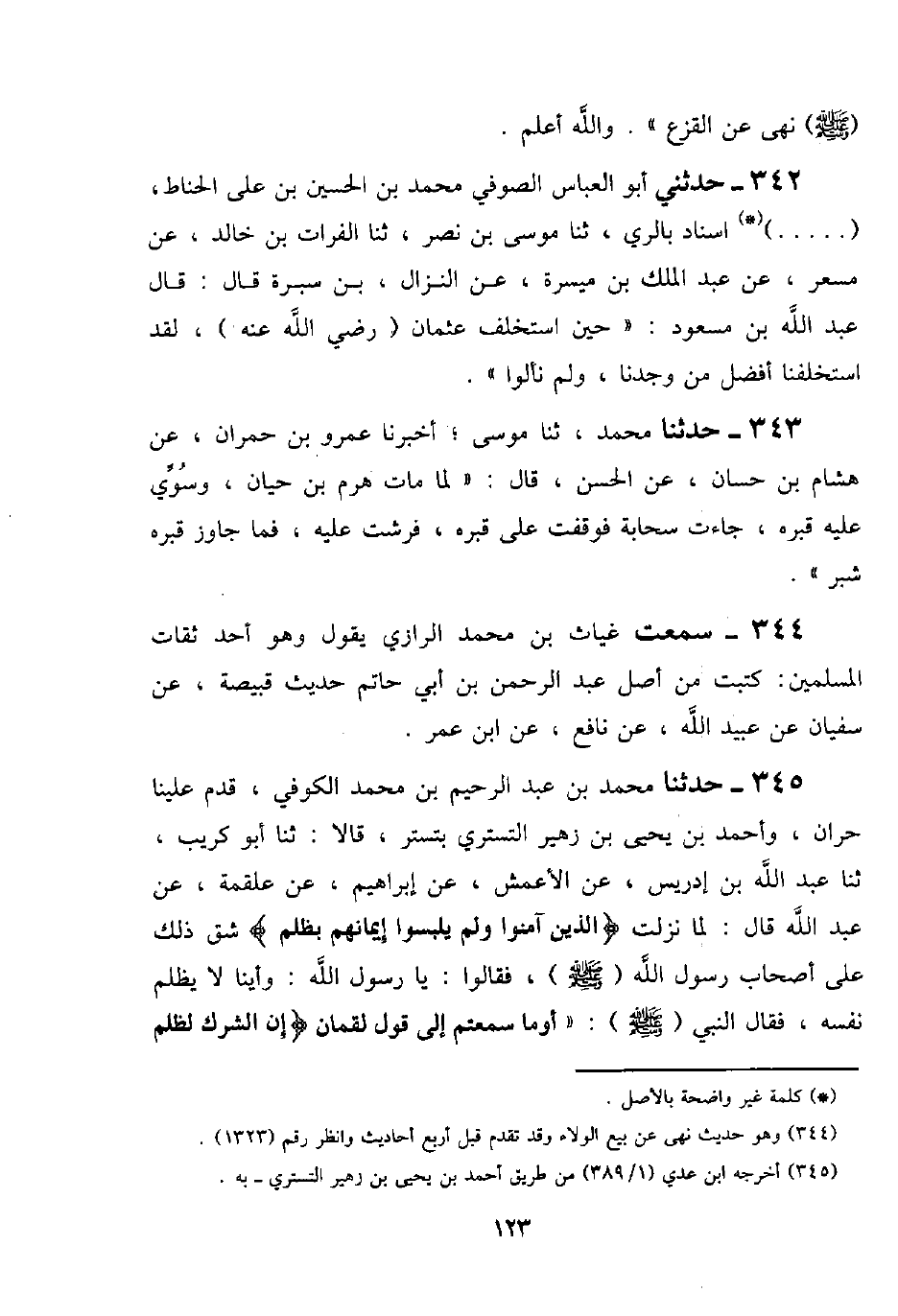 325 - حَدَّثَنَا مُحَمَّدُ بْنُ عَبْدِ الرَّحِيمِ بْنِ مُحَمَّدٍ الْكُوفِيُّ قَدِمَ عَلَيْنَا حَرَّانُ، وَأَحْمَدُ بْنُ يَحْيَى بْنِ زُهَيْرٍ التُّسْتَرِيُّ بِتُسْتَرَ قَالَا: ثنا أَبُو كُرَيْبٍ، ثنا عَبْدُ اللَّهِ بْنُ إِدْرِيسَ، عَنِ الْأَعْمَشِ، عَنْ إِبْرَاهِيمَ، عَنْ عَلْقَمَةَ، عَنْ عَبْدِ اللَّهِ قَالَ: لَمَّا نَزَلَتْ {الَّذِينَ §آمَنُوا وَلَمْ يَلْبِسُوا} [الأنعام: 82] إِيمَانَهُمْ بِظُلْمٍ شَقَّ ذَلِكَ عَلَى أَصْحَابِ رَسُولِ اللَّهِ صَلَّى اللَّهُ عَلَيْهِ وَسَلَّمَ، فَقَالُوا: يَا رَسُولَ اللَّهِ: وَأَيُّنَا لَا يَظْلِمُ نَفْسَهُ، فَقَالَ النَّبِيُّ صَلَّى اللَّهُ عَلَيْهِ وَسَلَّمَ: " أَوَمَا سَمِعْتُمْ إِلَى قَوْلِ لُقْمَانَ {إِنَّ الشِّرْكَ} [لقمان: 13] لَظُلْمٌ -[124]- عَظِيمٌ " قَالَ ابْنُ إِدْرِيسَ: حَدَّثَنِيهِ أَبِي عَنْ أَبَانَ بْنِ تَغْلِبَ عَنِ الْأَعْمَشِ، ثُمَّ لَقِيتُ الْأَعْمَشَ فَحَدَّثَنِي بِهِ سَمِعْتُ أَبَا بَكْرٍ الْجِعَابِيَّ يَقُولُ: حَدَّثَ بِهَذَا الْحَدِيثِ مُحَمَّدُ بْنُ عَبْدِ اللَّهِ بْنِ نُمَيْرٍ مِثْلَ مَا حَدَّثَ بِهِ أَبُو كُرَيْبٍ