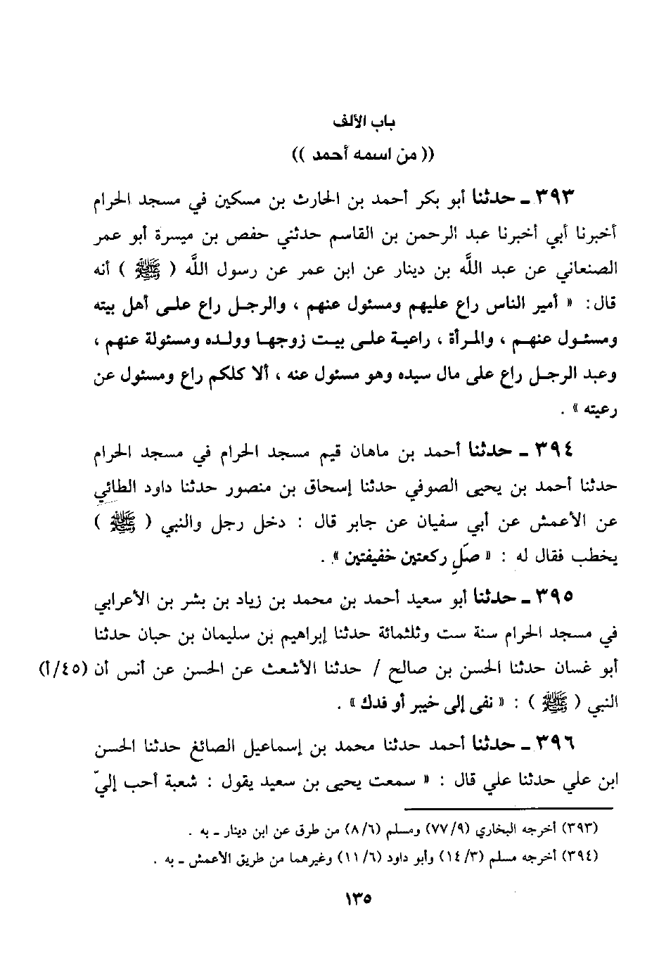 372 - حَدَّثَنَا أَبُو بَكْرٍ أَحْمَدُ بْنُ الْحَارِثِ بْنِ مِسْكِينٍ فِي مَسْجِدِ الْحَرَامِ أَخْبَرَنَا أَبِي، أَخْبَرَنَا عَبْدُ الرَّحْمَنِ بْنُ الْقَاسِمِ، حَدَّثَنِي حَفْصُ بْنُ مَيْسَرَةَ أَبُو عُمَرَ الصَّنْعَانِيُّ، عَنْ عَبْدِ اللَّهِ بْنِ دِينَارٍ، عَنِ ابْنِ عُمَرَ، عَنْ رَسُولِ اللَّهِ صَلَّى اللَّهُ عَلَيْهِ وَسَلَّمَ أَنَّهُ قَالَ: «§أَمِيرُ النَّاسِ رَاعٍ عَلَيْهِمْ وَمَسْئُولٌ عَنْهُمْ، وَالرَّجُلُ رَاعٍ عَلَى أَهْلِ بَيْتِهِ وَمَسْئُولٌ عَنْهُمْ، وَالْمَرْأَةُ رَاعِيَةٌ عَلَى بَيْتِ زَوْجِهَا وَوَلَدِهِ وَمَسْئُولَةٌ عَنْهُمْ، وَعَبْدُ الرَّجُلِ رَاعٍ عَلَى مَالِ سَيِّدِهِ وَهُوَ مَسْئُولٌ عَنْهُ، أَلَا كُلُّكُمْ رَاعٍ وَمَسْئُولٌ عَنْ رَعِيَّتِهِ»