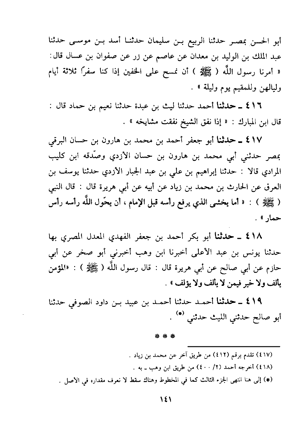 396 - حَدَّثَنَا أَبُو جَعْفَرٍ أَحْمَدُ بْنُ مُحَمَّدِ بْنِ هَارُونَ بْنِ حَسَّانَ الْبَرْقِيُّ بِمِصْرَ حَدَّثَنِي أَبِي مُحَمَّدُ بْنُ هَارُونَ بْنِ حَسَّانَ الْأَزْدِيُّ، وَصَدَّقَهُ ابْنُ كُلَيْبٍ الْمُرَادِيُّ قَالَا: حَدَّثَنَا إِبْرَاهِيمُ بْنُ عَلِيِّ بْنِ عَبْدِ الْجَبَّارِ الْأَزْدِيُّ، حَدَّثَنَا يُوسُفُ بْنُ الْعَرَقِ، عَنِ الْحَارِثِ بْنِ مُحَمَّدِ بْنِ زِيَادٍ، عَنْ أَبِيهِ، عَنْ أَبِي هُرَيْرَةَ قَالَ: قَالَ النَّبِيُّ صَلَّى اللَّهُ عَلَيْهِ وَسَلَّمَ: «§أَمَا يَخْشَى الَّذِي يَرْفَعُ رَأْسَهُ قَبْلَ الْإِمَامِ أَنْ يُحَوِّلَ اللَّهُ رَأْسَهُ رَأْسَ حِمَارٍ»