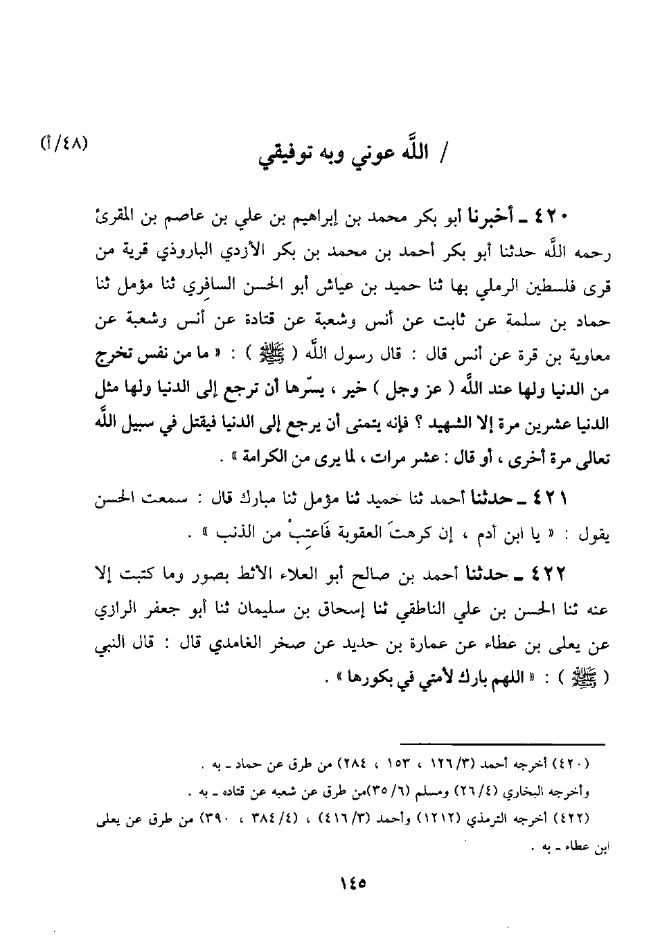 401 - حَدَّثَنَا أَبُو الْجَهْمِ أَحْمَدُ بْنُ الْحُسَيْنِ بْنِ طَلَابٍ الشَّعْرَانِيُّ بِدِمَشْقَ بِبَيْتِ أَلَاهِيَا ثنا أَحْمَدُ بْنُ أَبِي الْحَوَارِي، ثنا حَفْصُ بْنُ غِيَاثٍ، ثنا مِسْعَرٌ، وَالْعَوَّامُ بْنُ حَوْشَبٍ، عَنْ إِبْرَاهِيمَ السَّكْسَكِيِّ، عَنْ أَبِي بُرْدَةَ، عَنْ أَبِي مُوسَى قَالَ: قَالَ رَسُولُ اللَّهِ صَلَّى اللَّهُ عَلَيْهِ وَسَلَّمَ: «§مَنْ مَرِضَ أَوْ سَافَرَ كَانَ لَهُ مِنَ الْأَجْرِ مِثْلُ مَا كَانَ يَعْمَلُ وَهُوَ صَحِيحٌ مُقِيمٌ»
