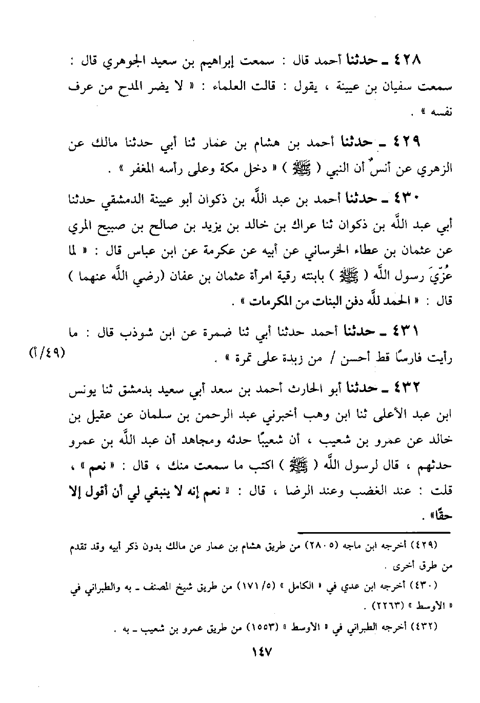 411 - حَدَّثَنَا أَبُو الدَّحْدَاحِ أَحْمَدُ بْنُ مُحَمَّدِ بْنِ إِسْمَاعِيلَ التَّمِيمِيُّ ثنا أَبُو عَامِرٍ مُوسَى بْنُ عَامِرِ بْنِ خُرَيْمٍ ثنا الْوَلِيدُ بْنُ مُسْلِمٍ، ثنا الْأَوْزَاعِيُّ، عَنْ قَتَادَةَ، عَنْ أَنَسٍ قَالَ: ذُكِرَ رَجُلٌ عِنْدَ رَسُولِ اللَّهِ صَلَّى اللَّهُ عَلَيْهِ وَسَلَّمَ فَذَكَرُوا مِنْ قُوَّتِهِ فِي الْجِهَادِ وْالِاجْتِهَادِ وَفِي الْعِبَادَةِ فَأَقْبَلَ الرَّجُلُ، فَقَالَ رَسُولُ اللَّهِ صَلَّى اللَّهُ عَلَيْهِ وَسَلَّمَ: «وَالَّذِي نَفْسِي بِيَدِهِ، أَتَى الَّذِي فِي وَجْهِهِ سَفْعَةٌ مِنَ الشَّيْطَانِ» ثُمَّ أَقْبَلَ فَسَلَّمَ عَلَيْهِمْ، فَقَالَ رَسُولُ اللَّهِ صَلَّى اللَّهُ عَلَيْهِ وَسَلَّمَ: «هَلْ حَدَّثْتَ نَفْسَكَ حِينَ أَشْرَفْتَ عَلَيْنَا أَنَّهُ لَيْسَ فِي الْقَوْمِ أَحَدٌ خَيْرٌ مِنْكَ؟» قَالَ: نَعَمْ، وَذَهَبَ فَاخْتَطَّ مَسْجِدًا، وَصَفَّ قَدَمَيْهِ، ثُمَّ صَلَّى فَقَالَ رَسُولُ اللَّهِ صَلَّى اللَّهُ عَلَيْهِ وَسَلَّمَ: " أَيُّكُمْ يَقُومُ إِلَيْهِ فَيَقْتُلُهُ؟ فَذَهَبَ أَبُو بَكْرٍ فَوَجَدَهُ يُصَلِّي قَالَ: فَهَابَ أَنْ قَتَلَهُ، فَقَالَ رَسُولُ اللَّهِ صَلَّى اللَّهُ عَلَيْهِ وَسَلَّمَ: «أَيُّكُمْ يَقُومُ إِلَيْهِ فَيَقْتُلُهُ؟» فَقَامَ عُمَرُ فَقَالَ: أَنَا أَذْهَبُ إِلَيْهِ فَوَجَدَهُ يُصَلِّي، فَصَنَعَ مِثْلَ مَا صَنَعَ أَبُو بَكْرٍ ثُمَّ رَجَعَ، فَقَالَ عَلِيٌّ: أَنَا، فَقَالَ: ائْتِهِ، إِنْ أَدْرَكْتَهُ فَذَهَبَ فَوَجَدَهُ قَدِ انْصَرَفَ، فَقَالَ رَسُولُ اللَّهِ صَلَّى اللَّهُ عَلَيْهِ وَسَلَّمَ: «إِنَّ هَذَا لَأَوَّلَ قَرْنٍ يَخْرُجُ مِنْ أُمَّتِي لَوْ قَتَلَهُ مَا اخْتَلَفَ اثْنَانِ مِنْ أُمَّتِي» ثُمَّ قَالَ: «إِنَّ بَنِي إِسْرَائِيلَ افْتَرَقَتْ عَلَى إِحْدَى وَسَبْعِينَ فِرْقَةً، وَإِنَّ §أُمَّتِي سَتَفْتَرِقُ عَلَى اثْنَتَيْنِ وَسَبْعِينَ كُلُّهَا فِي النَّارِ إِلَّا وَاحِدَةً وَهِيَ الْجَمَاعَةُ»