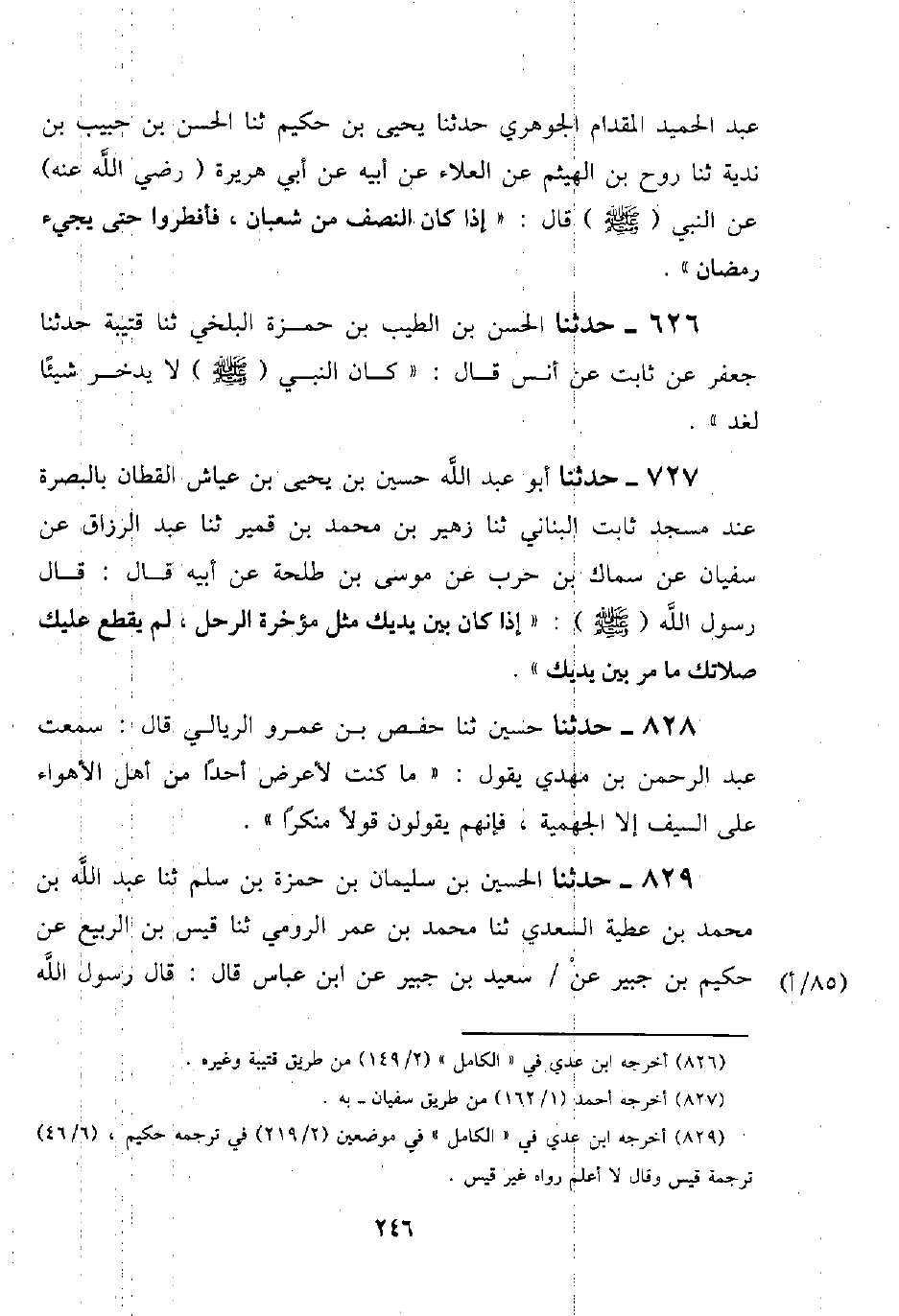 803 - حَدَّثَنِي حُسَيْنٌ، ثنا مُحَمَّدُ بْنُ الْحَجَّاجِ، ثنا أَبُو مُعَاوِيَةَ، عَنْ هِشَامِ بْنِ عُرْوَةَ، عَنْ أَبِيهِ، عَنْ عَائِشَةَ قَالَتْ: " §كَانَتِ امْرَأَةٌ تَغَشَّانَا فَتَمَثَّلَتْ بِهَذَا الْبَيْتِ: -[247]-