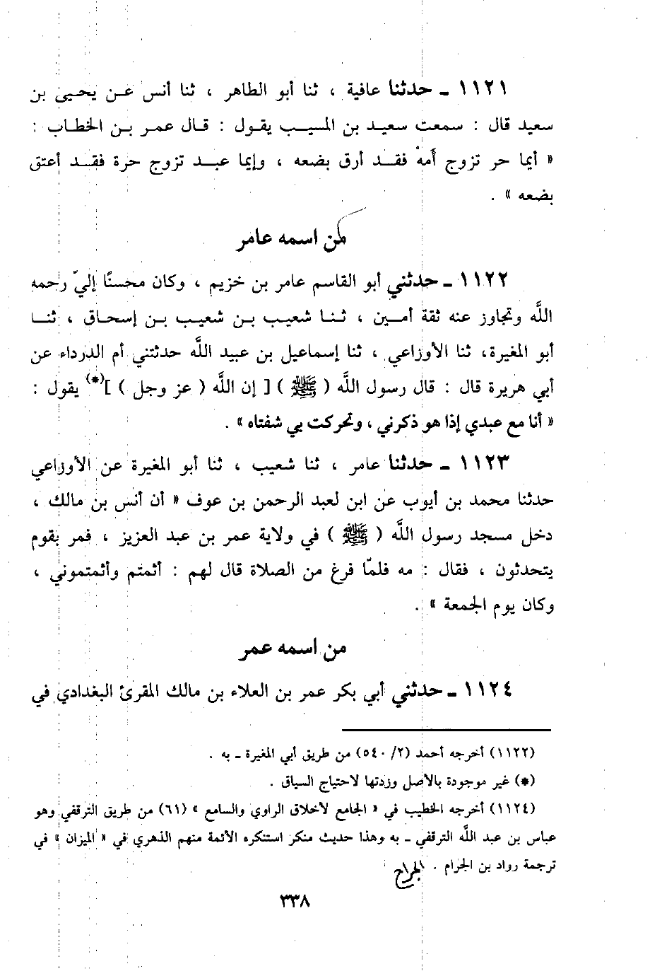1108 - حَدَّثَنَا أَبُو حَفْصٍ عُمَرُ، ثنا أَبُو عِمْرَانَ بْنُ مُوسَى بْنِ هِشَامِ بْنِ أَحْمَدَ بْنِ الْعَلَاءِ، بِدِمَشْقَ، ثنا حَمْدَانُ، ثنا الْوَلِيدُ بْنُ الرِّبِّيَانِ، ثنا نَصْرُ بْنُ أَبَانَ، عَنْ مُوسَى بْنِ جَابَانَ، عَنِ الْمُعَافَى بْنِ عِمْرَانَ، عَنْ جَعْفَرِ بْنِ بُرْقَانَ، عَنْ مَيْمُونِ بْنِ مِهْرَانَ، عَنْ حُمْرَانَ بْنِ أَبَانَ بْنِ عُثْمَانَ، عَنْ عُثْمَانَ بْنِ عَفَّانَ، §فِي الْمُحْرِمِ يَدْخُلُ الْبُسْتَانَ قَالَ: «نَعَمْ، وَيَشُمُّ الرَّيْحَانَ»